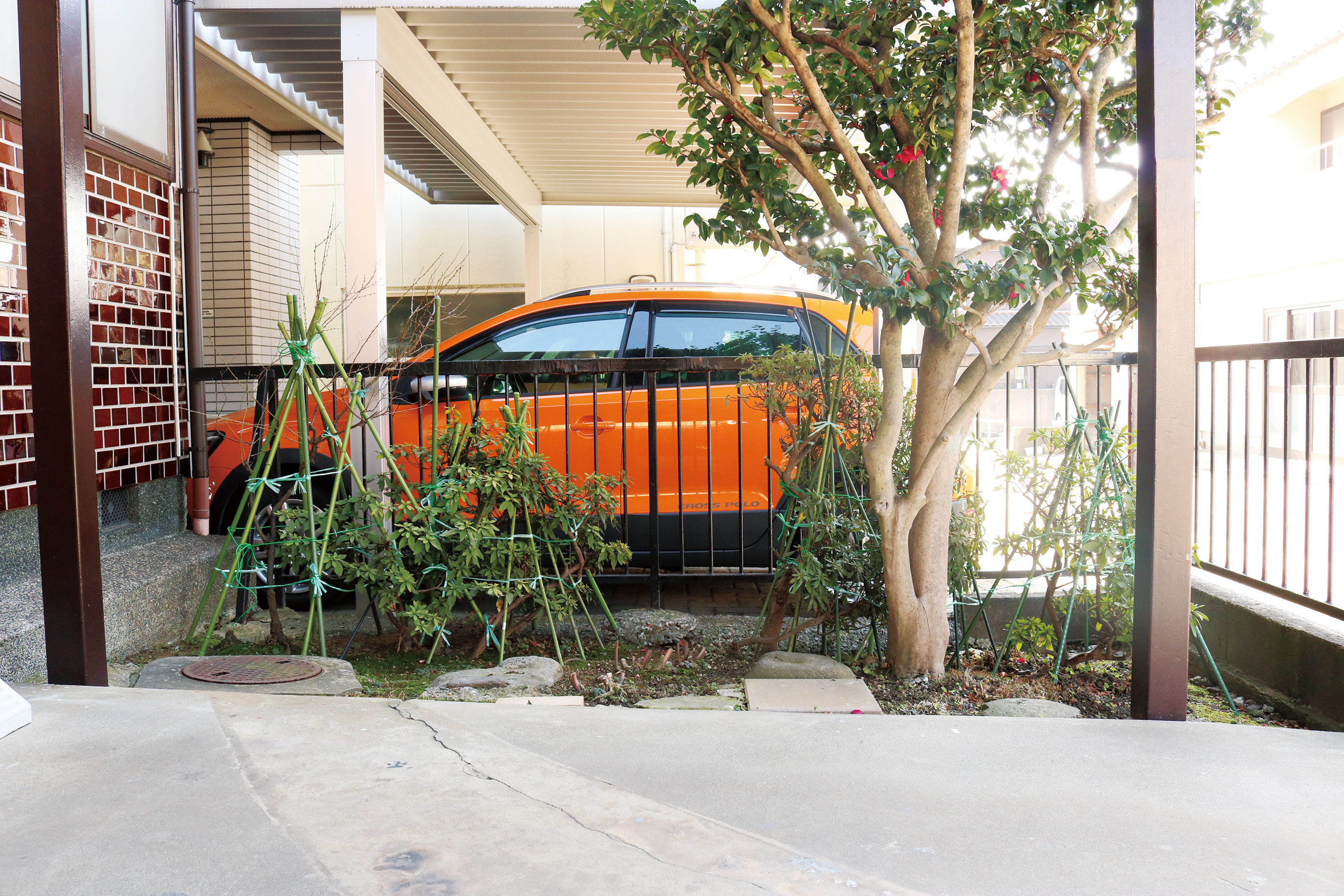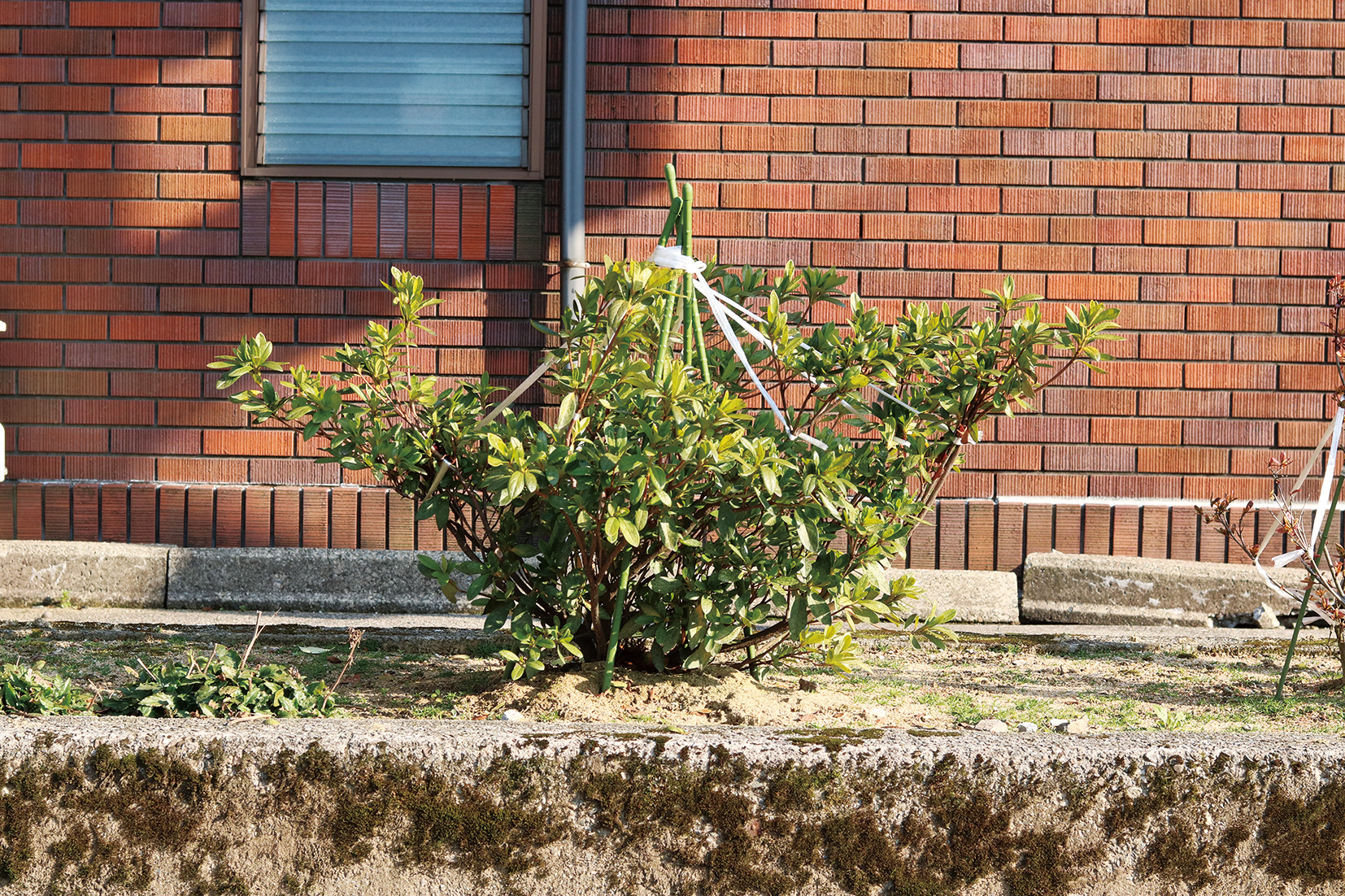 一方、低木の場合、ハンガーパイプのように竹の屋根を渡して、そこから枝を吊るという手法も。