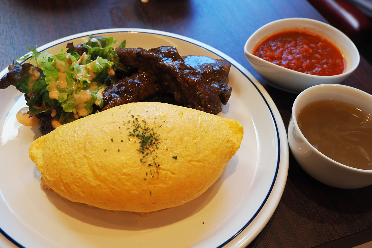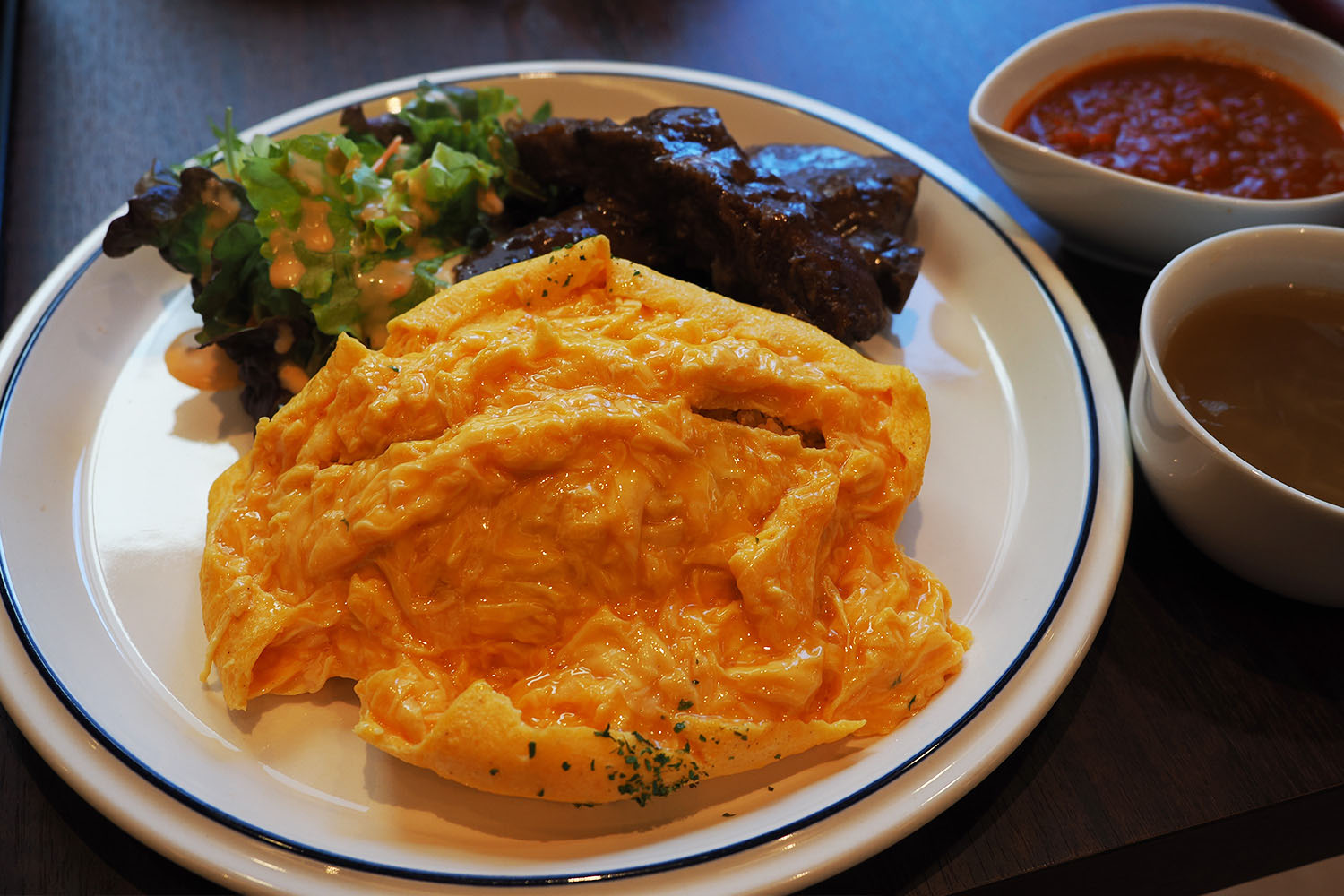 完熟トマトソースは私好みに酸味がほどよくあり、フワフワの卵とマッチしてとろけるようにおいしかった。また、ポークリブはホロホロでなんと柔らかなことよ……!