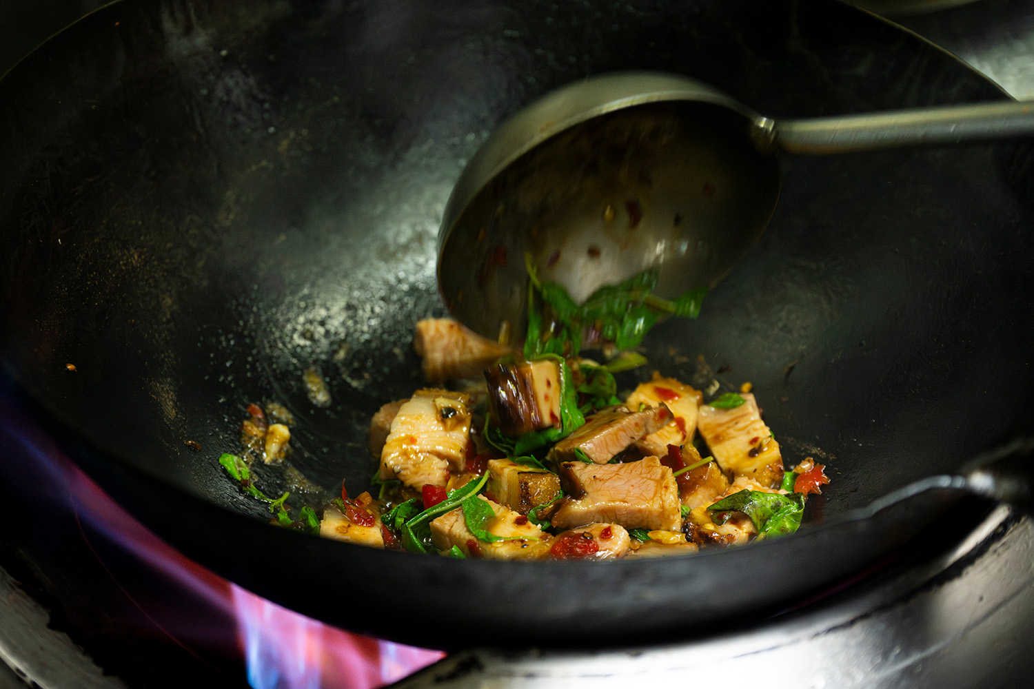 白飯に合うのはガパオ・ムークロープだ。日本人にもガパオ(ホーリーバジル)を使った料理はすっかりおなじみになったが、タイには実にいろいろなバリエーションがある。そのひとつがムークロープ。皮つきの豚バラ肉を揚げたものだ。これ、皮のカリカリ、肉や脂のトロトロ、ふたつの食感が混ざり合って実にいけるのだが、さらにガパオの香りと唐辛子の辛さとが味にパンチを与えている。