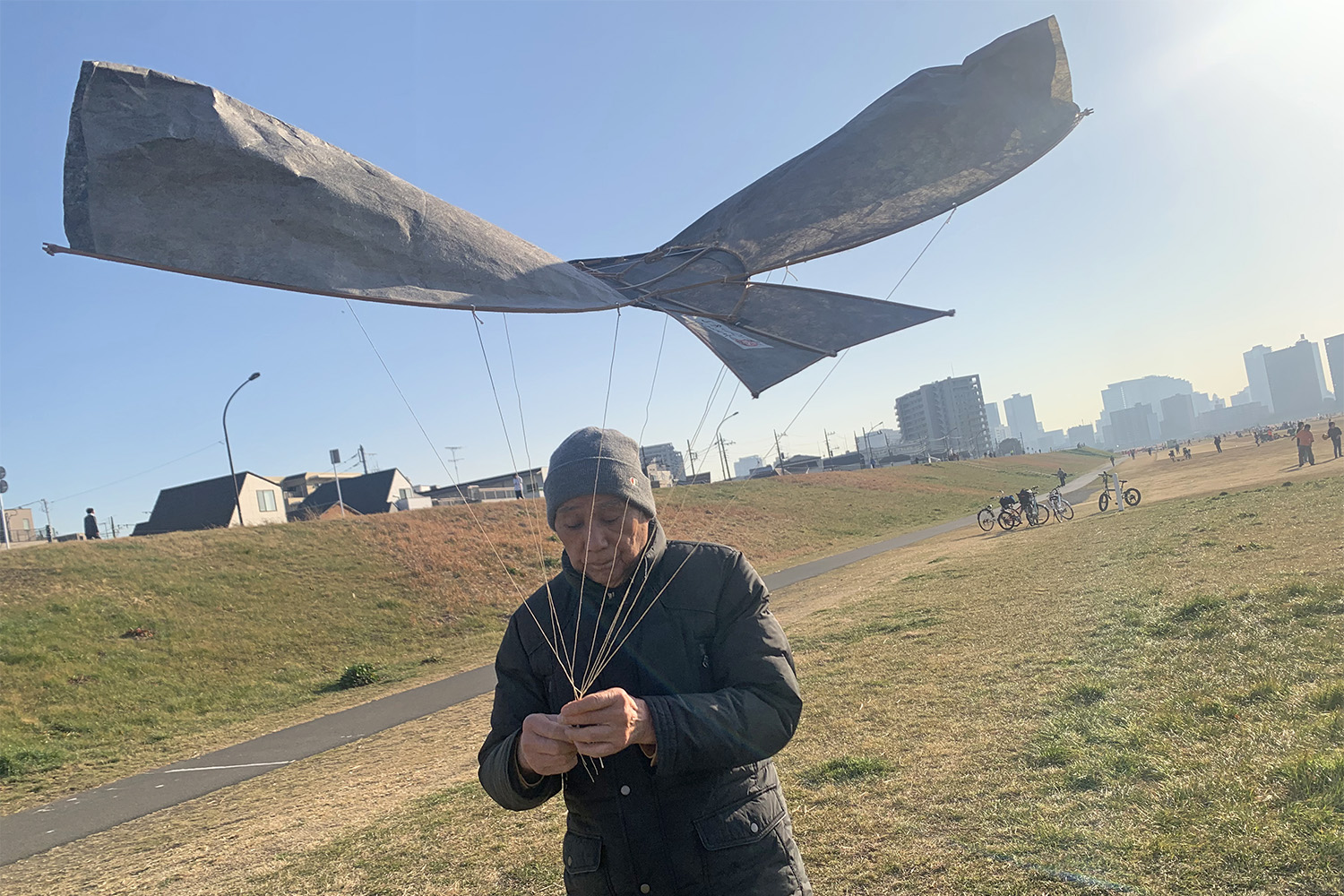 この日は冬の合間の暖かい日で、満足できる高さまではあがらなかった。「やっぱり寒い日の夕方がいちばんいいんだけど。凧あげは10回やって3回うまくいくくらいだね」と吉田さん。