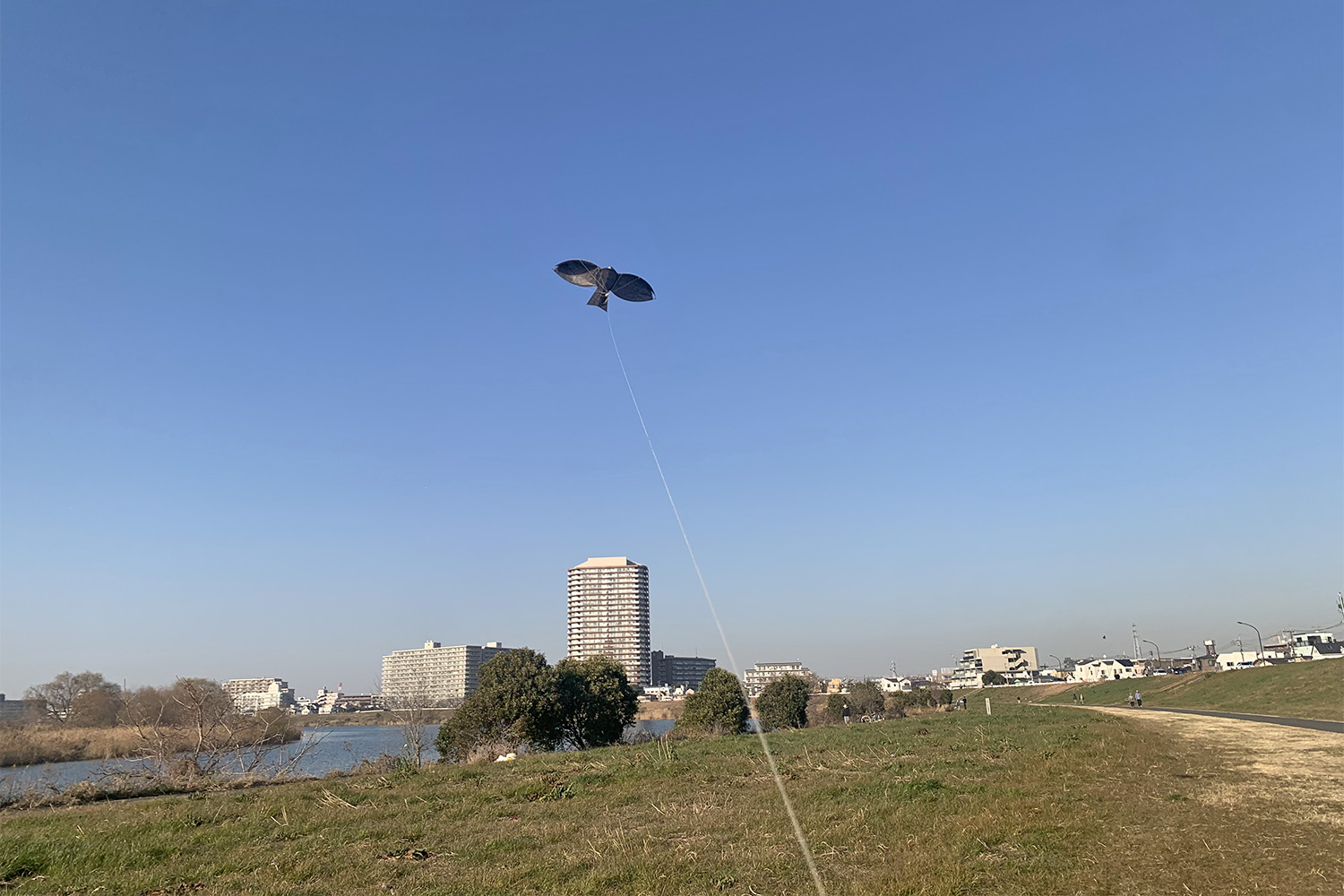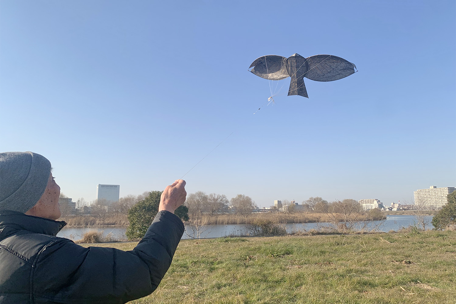さっそく出来上がった凧をあげに、吉田さんと多摩川河川敷へご一緒した。吉田さんは大きいとんび凧を持ってきてくださった。かっこいい!