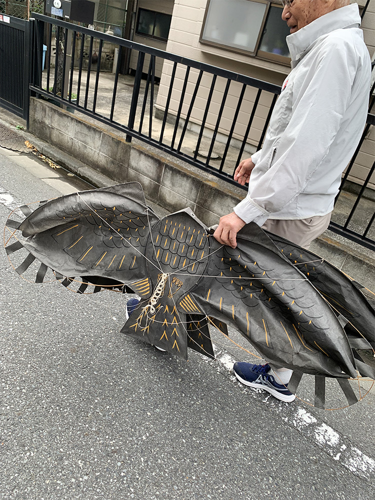 通りすがりの子供たちからも「すげえ」「かっこいい!」という歓声があがり、道行く大人も思わず足を止めている。とんび凧のあがる様子を、大人も子供も楽しんで観ていた。