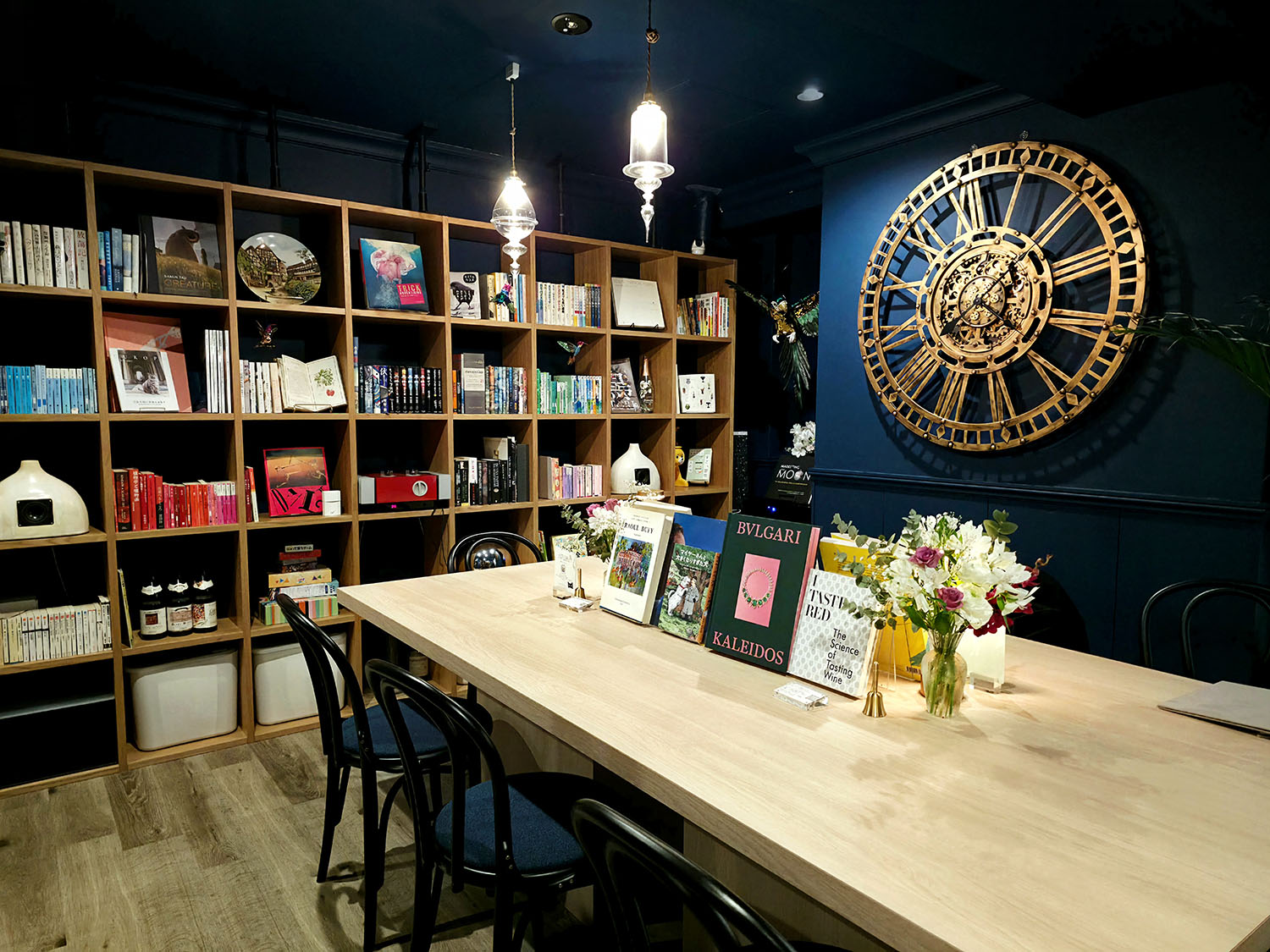 テーブルや本棚には、店主の半田さんの好きな本やコレクションが並びます。