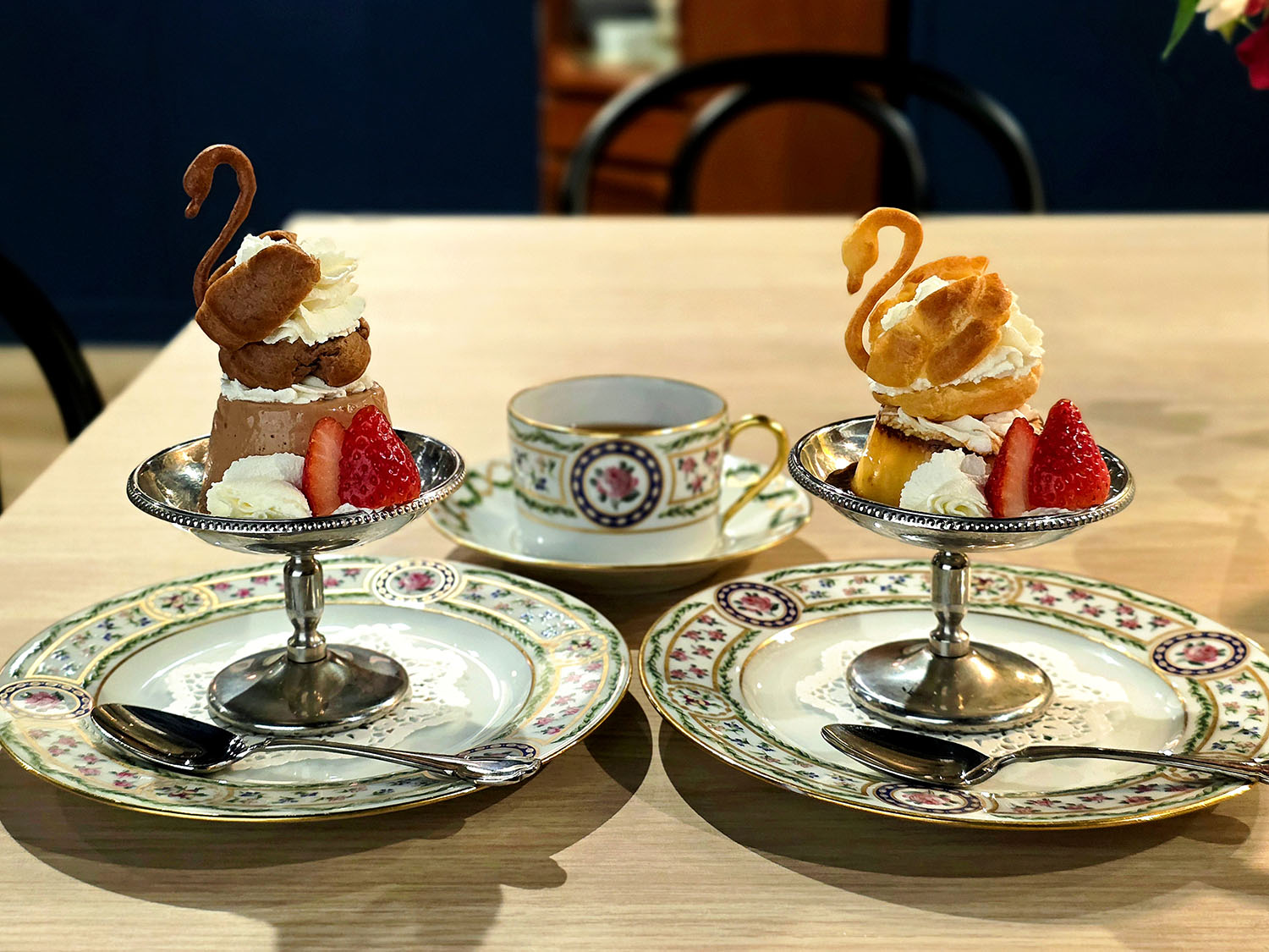 “白鳥の湖プリン”と“黒鳥の湖ババロア”をオーダーする時は、お皿がセットになるティーカップもあるので相談してみてね。