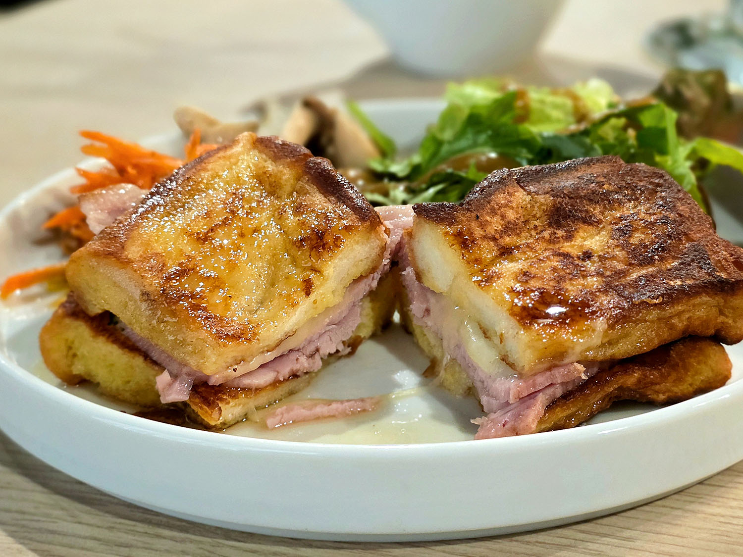 ふわふわのフレンチトーストの間から、あふれ出るチーズとハム。