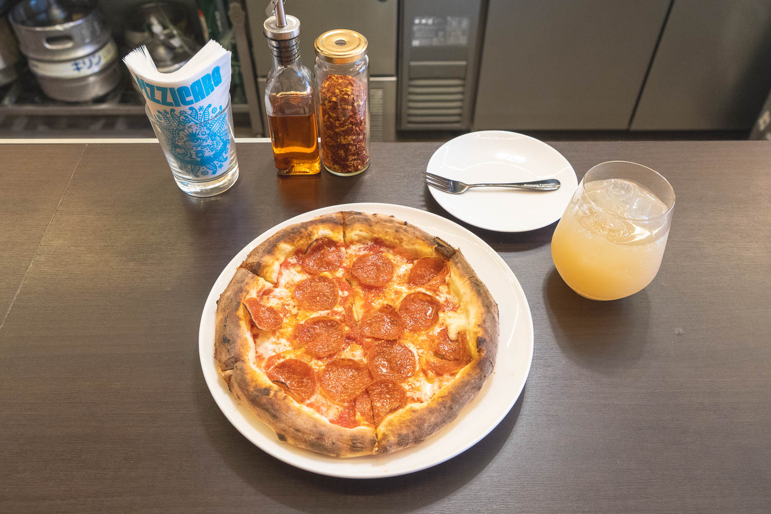 今、ニューヨークに使っているペパロニソーセージはそのときから使っているものだ。『Pizzicare』のピザは薄焼きで、1人で1枚食べられるボリューム。この点は、ナポリピッツァのスタイルを思わせる。中央部分を覆うようなペパロニの油分と辛味、塩加減がトマトソースと組み合わさった味わいは、アメリカンなジャンクさだ。