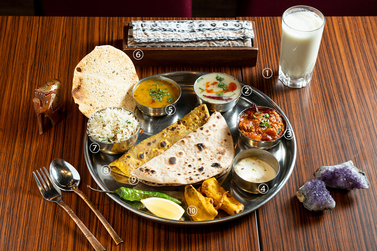 店の自慢メニューはいろいろあるけれど、食べてみたいのはやっぱり「グジャラーティ・ターリー・スーラト・ヌ・ジャマン」だろう。インドの中でもとりわけジャイナ教徒が多いグジャラート州スタイルのターリー(大皿料理)だ。