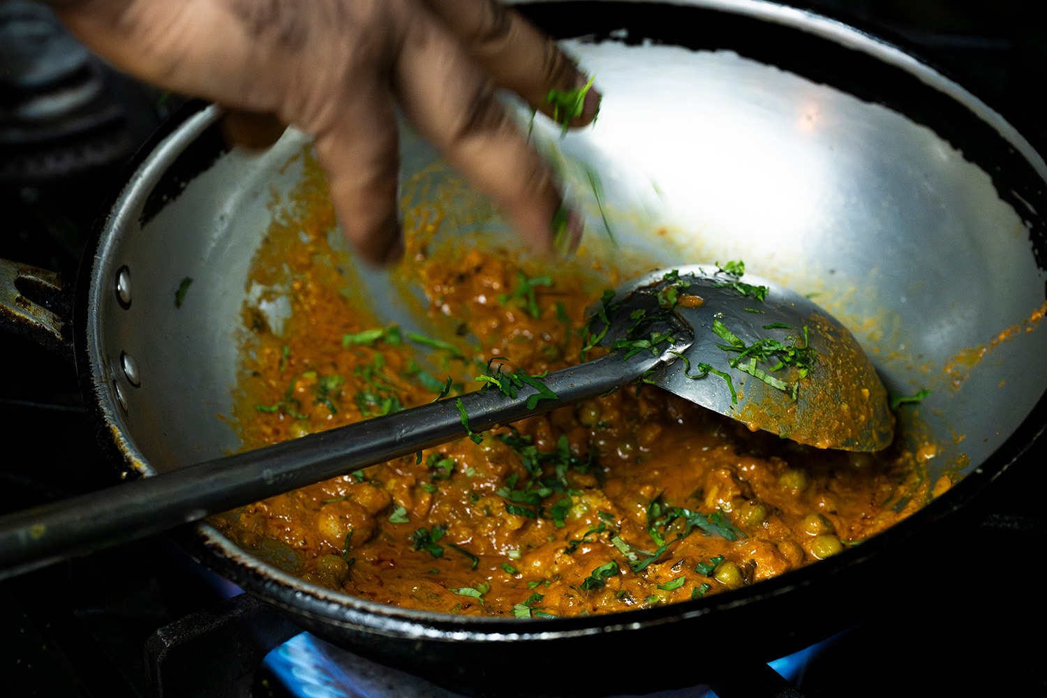 こうした料理に合うのはチャパティのほか、メティ・ナ・テプラというパン。メティとはひよこ豆の粉と全粒粉にフェヌグリークの葉を加えて焼いたもので、ほのかな苦味がなんともクセになる。そしてパコラという野菜の揚げ物だが、厳格なジャイナ教徒にはピーマンを、そうでない客にはカリフラワーを使って出している。シェフたちは口々に言う。