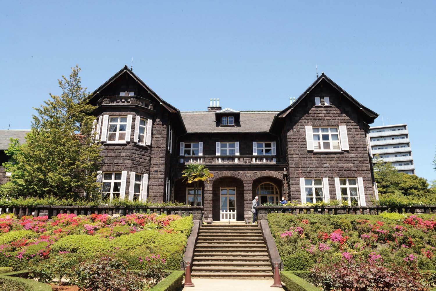 戸川播磨守の屋敷跡。英国人建築家・ジョサイア・コンドル設計の洋館とバラが咲くテラス花壇が美しい。低地には池泉回遊式の日本庭園が広がる。