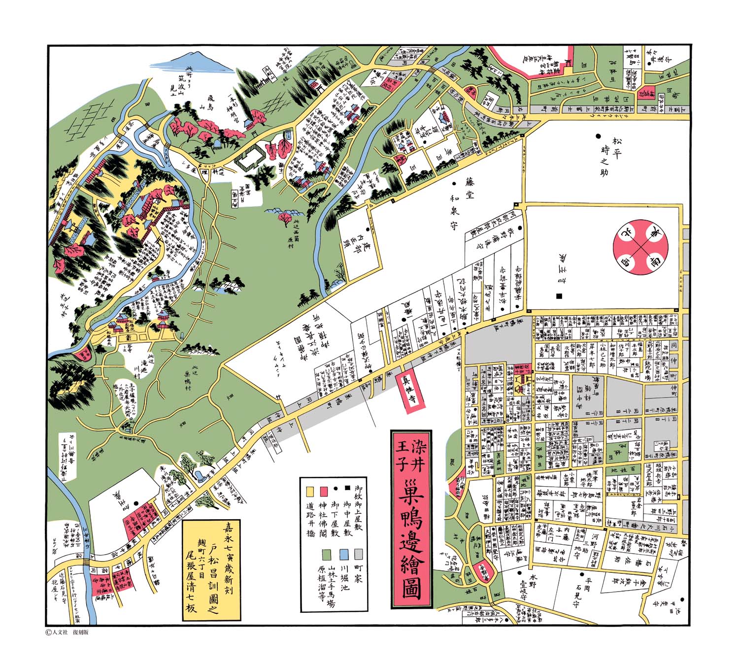 「王子」の地名の由来となった「王子権現」から落語『王子の狐』の舞台となった「王子稲荷社」、さらに徳川8代将軍吉宗の命でカエデが植えられたことから「紅葉寺」と呼ばれた「金剛寺」へと歩く。「飛鳥山」も吉宗の命で桜が植えられ、庶民が花見を楽しんだところで、切絵図にも桜の木が描かれている。錦絵には滝野川の風景が描かれているが、渓谷の滝や紅葉などの景勝地として有名だったことがわかる。