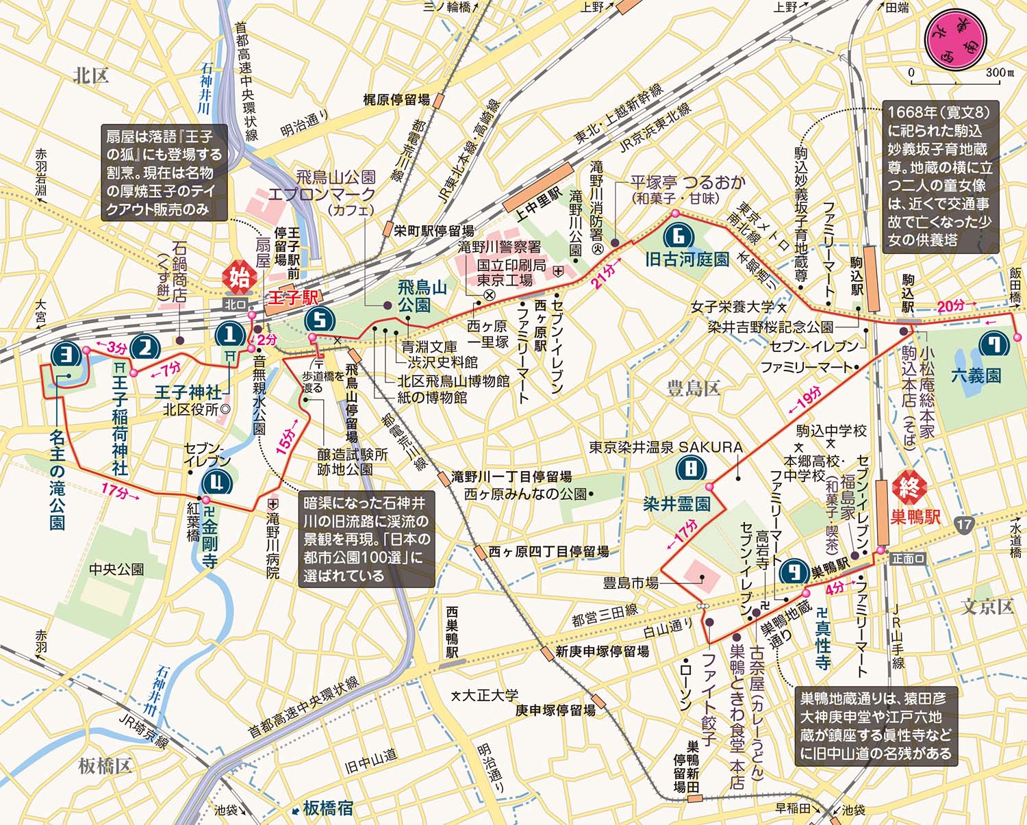 JR京浜東北線・地下鉄南北線王子駅→(2分/0.1km)→王子神社→(7分/0.5km)→王子稲荷神社→(3分/0.2km)→名主の滝公園→(17分/1.1km)→金剛寺→(15分/1.0km)→飛鳥山公園→(21分/1.4km)→旧古河庭園→(20分/1.3km)→六義園→(19分/1.2km)→染井霊園→(17分/1.2km)→真性寺→(4分/0.3km)→JR山手線・地下鉄三田線巣鴨駅