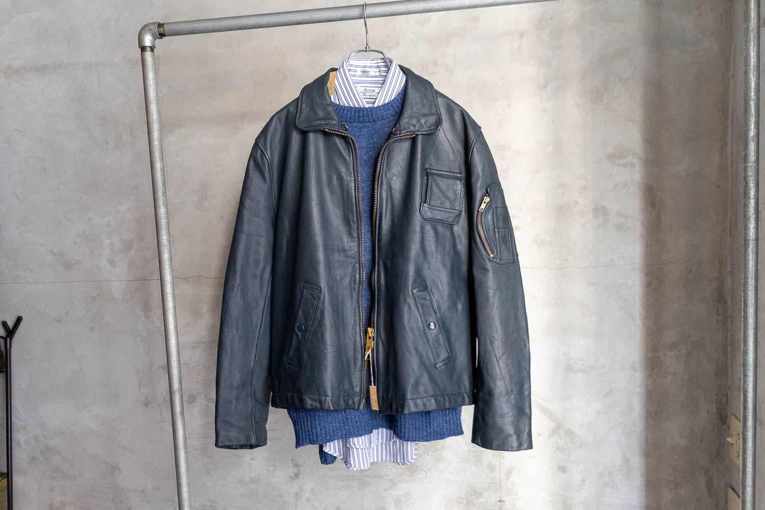 オーナーはミリタリーウェアの魅力を「すべてのデザインに目的があって、プロダクトデザインとして無駄がない」と話す。例えば、空軍パイロット向けに作られたレザージャケットには、ペンやトランシーバーなど入れるものに応じたポケットがあり、フロントのファスナーは座ったときに邪魔にならないよう上下から開閉可能になっている。ひとつひとつが人の動作を考えて作られているのだ。