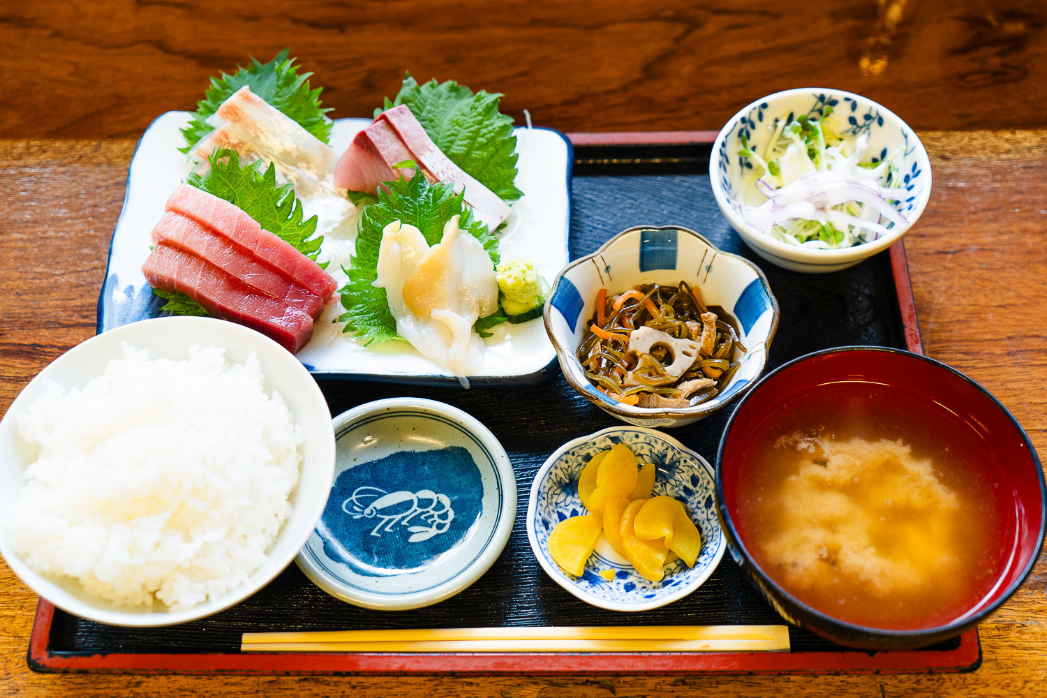特上刺身定食(盛合せ)は季節ごとの魚や貝の刺し身が4種類が盛り付けられている。刺し身にわさび醤油をつけてからたっぷりのご飯と一緒に食べる贅沢。小鉢やお味噌汁が自家製なのもうれしい。