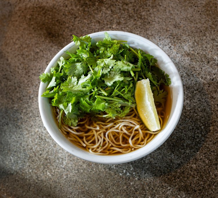 「十割そばを、もっとカジュアルに味わってもらいたいなと思って」と、店主の梅澤豪さん。旬の産地のソバ粉を用いた“手打ちに劣らぬ機械打ち”の十割そばが自慢だ。さらに、四季折々で変わり種もあり、この日はカルダモンを練り込んだそばが。ひと口つゆを飲むと控えめな薄味だが、そばをすすると本領発揮。噛めば甘みがじんわり広がり、追ってソバ粉の芳香が花開く。出汁のかつお節の香りと融合し、味の厚みは増すばかりだ。カルダモンとパクチーの爽快感に後押しされ、気づけば器にはつゆ一滴残らない。完食完飲なり!