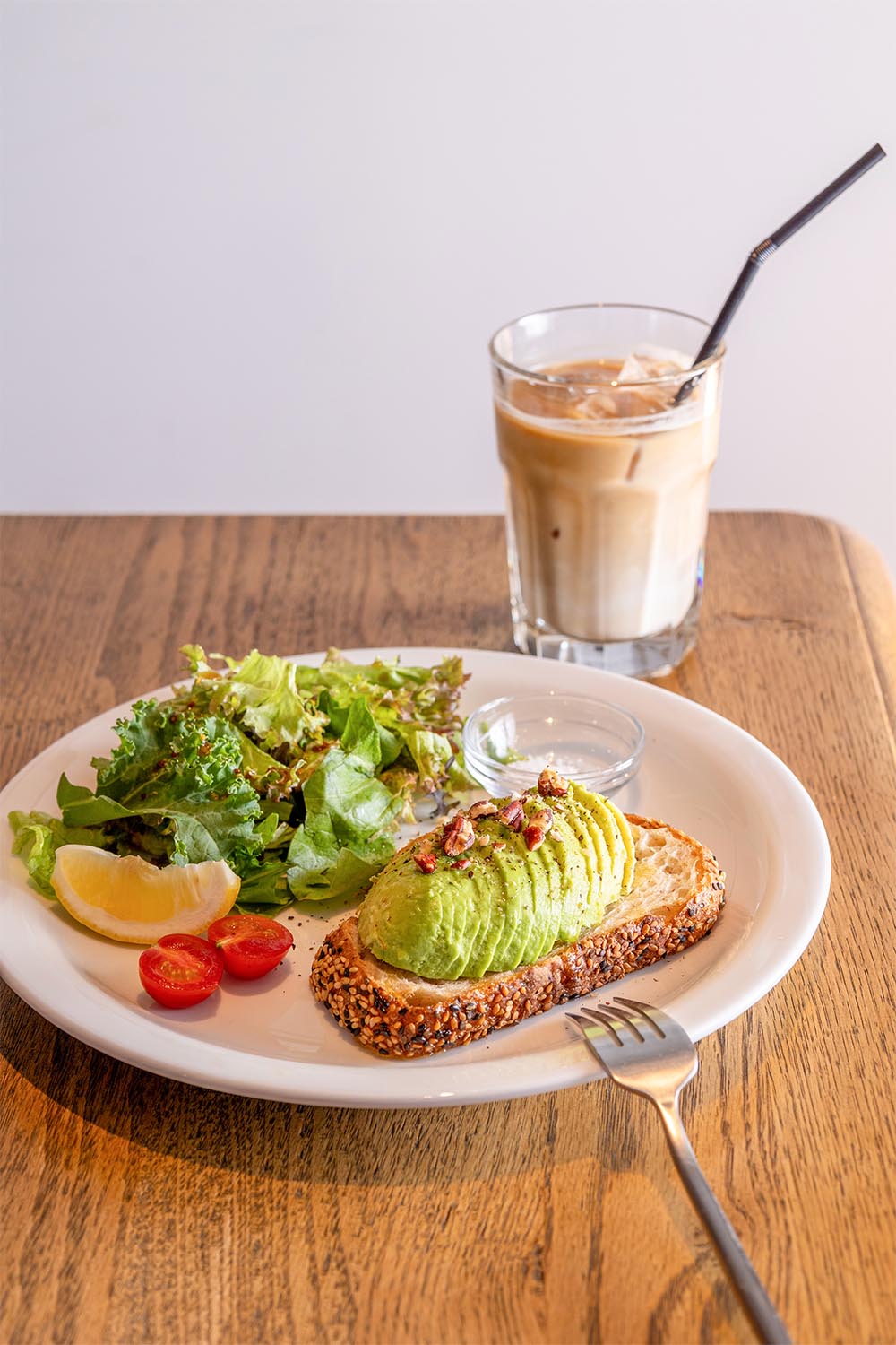 一歩入ると、そこはまるで映画のワンシーン。以前ここには会員制のサロンがあったそうで、当時の内装を生かしたゆとりのある空間でホッとひと息つける。ケーキや焼き菓子は店内で一から作り、フードも研究に研究を重ねる毎日。アヴォカドトーストは『パレスホテル東京』が手掛ける『エトヌンク』のパンを使い、味付けを極力シンプルにして素材の良さを引き出す。中煎りのエスプレッソがベースのさっぱりしたラテともぴったり。