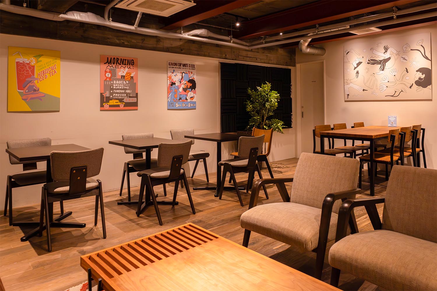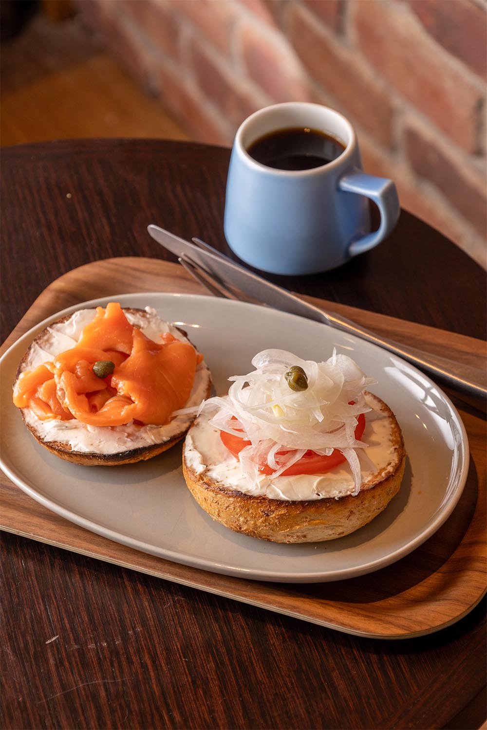 ニューヨークの『think coffee』日本第1号店。日本人に合わせて酸味を抑えた東京ブレンドをはじめ、店内で毎日焙煎する。アメリカンなフードも揃え、ベーグルサンドには『アルバラドストリートベーカリー』から冷凍のまま空輸されたオーガニックの全粒粉ベーグルを使用。むぎゅっとしつつ、焼くと表面がカリッとして歯切れがいいので具材ともなじむ。東京ブレンドの穏やかな苦味に引き立てられ、クリームチーズの風味が広がる。