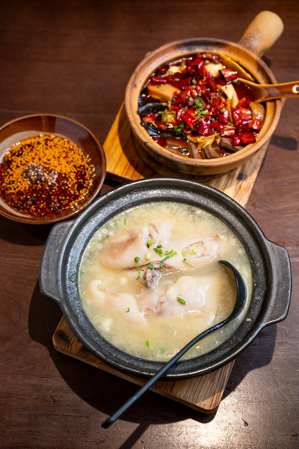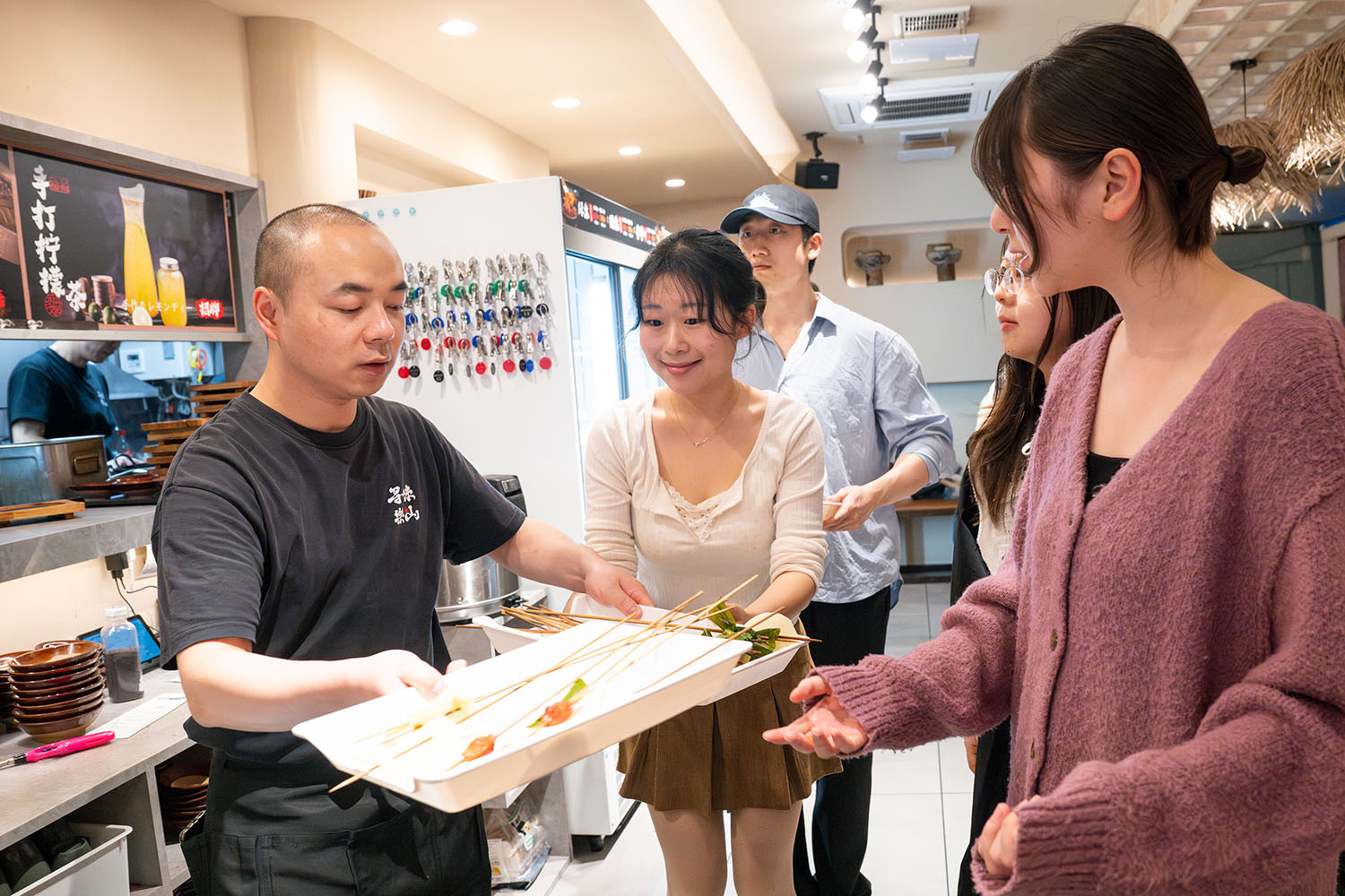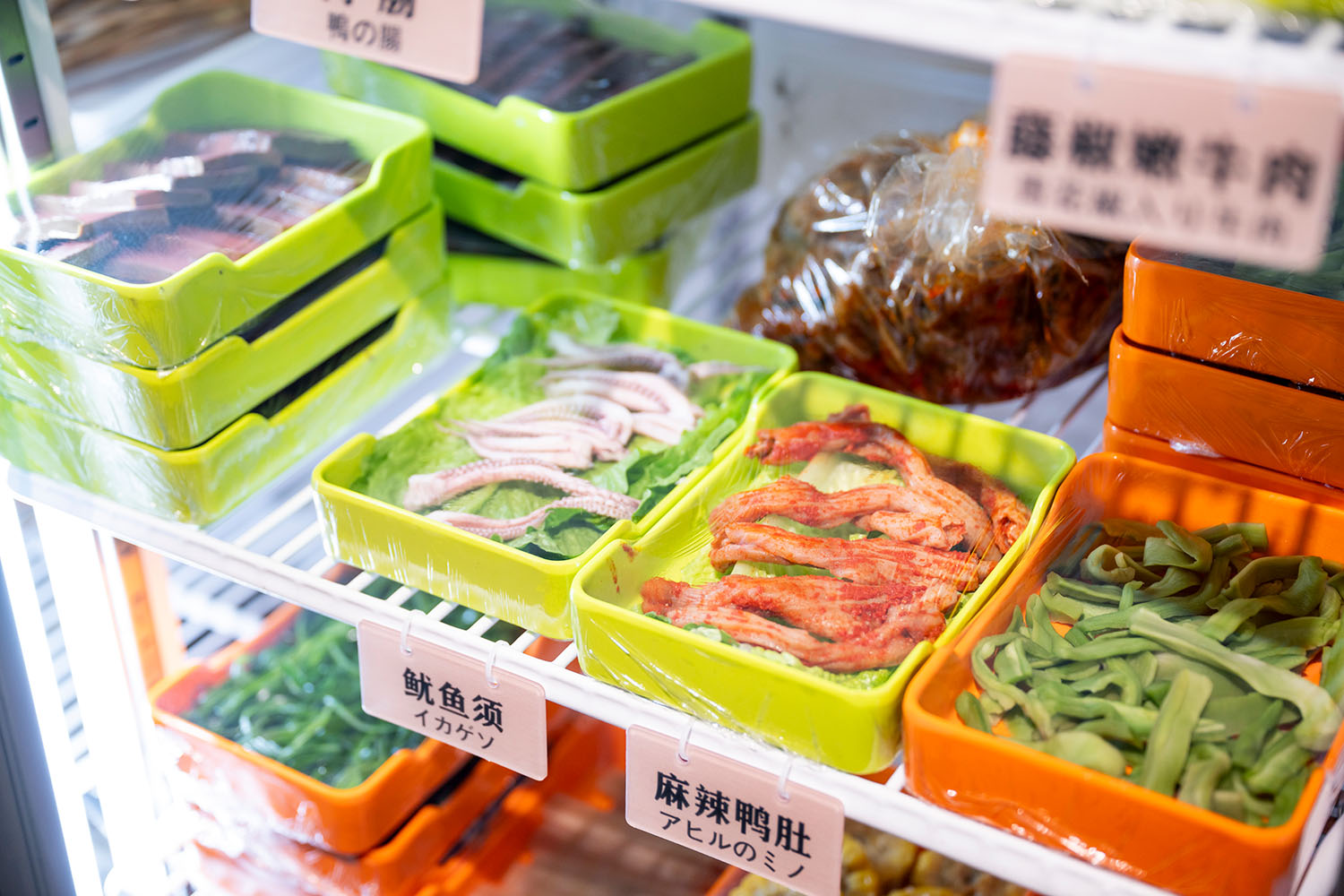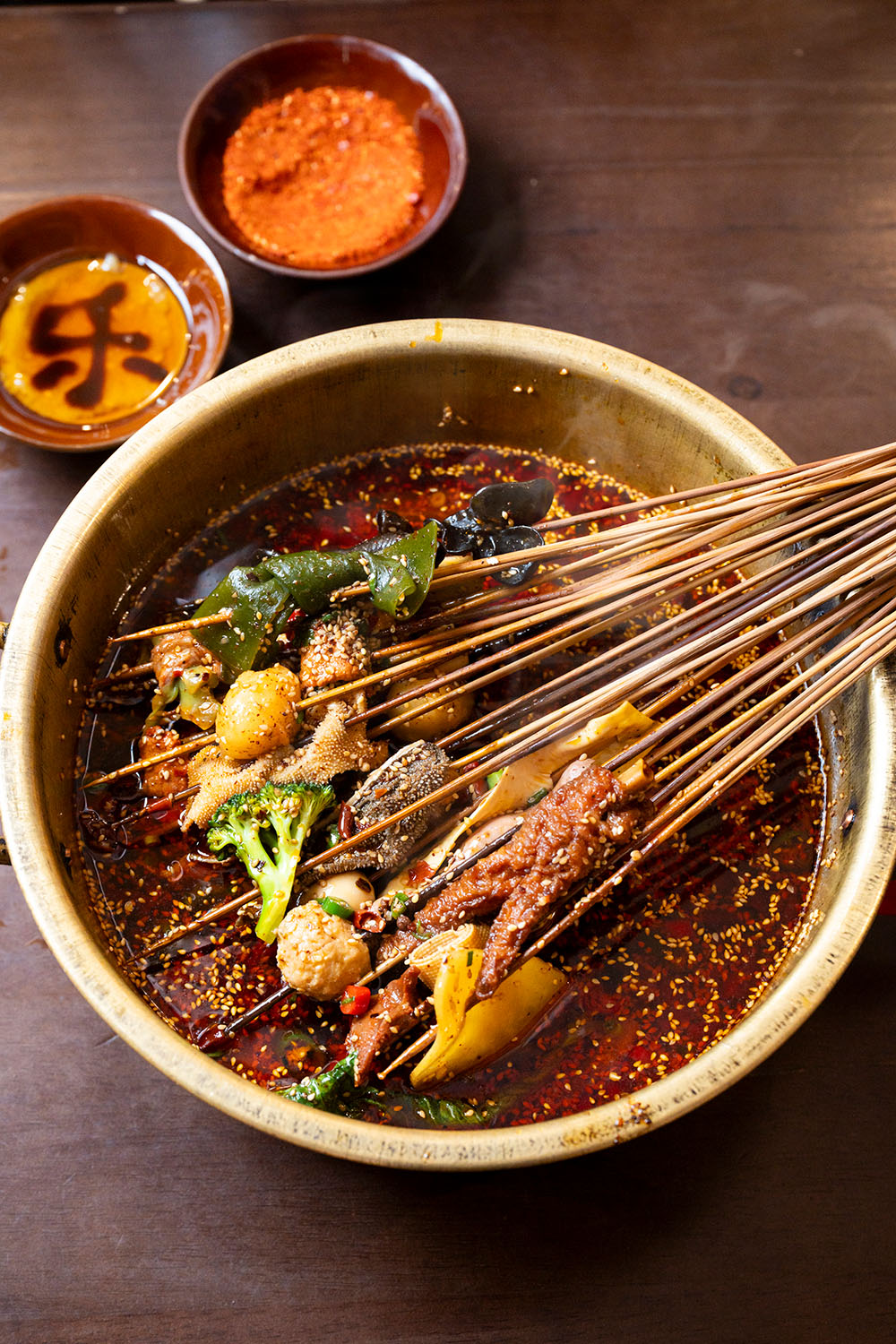 中国人、韓国人、日本人の若いグループはそう言いながら、みんなでお好みの串を選んでいる。豚や牛のモツ、練り物、野菜、それに鴨の舌とかアヒルのミノなんて見慣れないものも並ぶ。合わせて50種類ほどの具材からあれこれピックアップしてスタッフに渡すと、企業ヒミツの特製スープで茹(ゆ)でて味つけされ、さらに自家製の紅油(香りの高いラー油)ベースのスープで満たされた大鍋に入れられてやってくる。なるほど、みんなでワイワイ食べるにはちょうどいい。