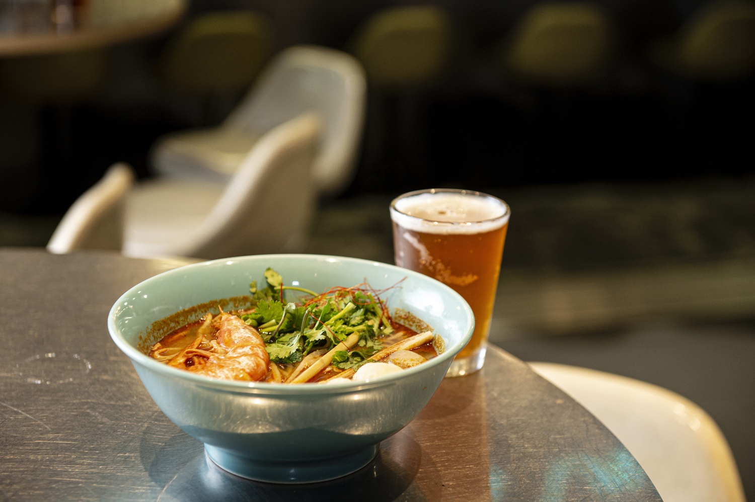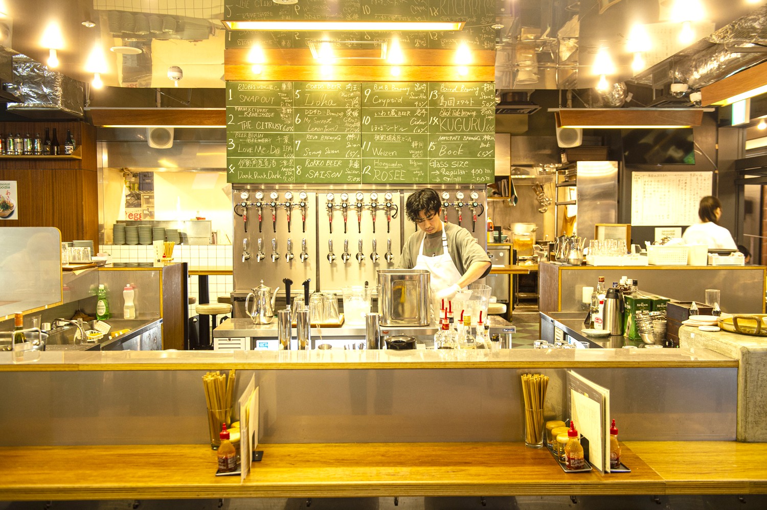 改札外の黒塀横丁にあるアジアンテイストの屋台風大衆酒場。丸の内と八重洲をつなぐ地下自由連絡通路から少し奥まった場所にあるため、東南アジアにある路地裏に迷い込んだよう。タイやシンガポール、ベトナム・中東の麺料理のほか、季節感と和の要素を取り入れたアジアンフードや、約15種類の樽生クラフトビールがスタンバイ。丸テーブルでわいわい盛り上げるのもよいが、オープンなカウンターは本当に異国の風が感じられるようで心地よい。