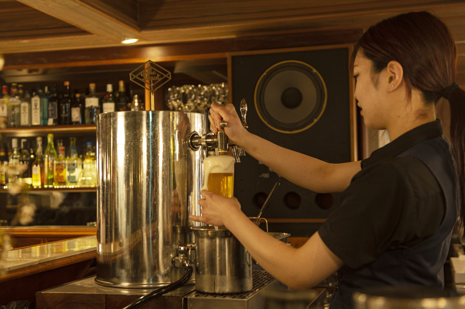 丸の内・八重洲北自由通路の新改札横にあるガラス張りのカフェバー。電球色のやわらかい照明の下、全席カウンターで構成されているため、外が眺められる席や、奥まった壁際の席、DJブース近くの席など、好みの席で思うように過ごすことができる。自家焙煎したエスプレッソをカラメルに使った「懐かしほろ苦プリン」700円が人気。昭和レトロな「スイングカラン」のビールサーバーもあり、店内はどこか懐かしい雰囲気に満ちている。キャッシュレス決済のみ。