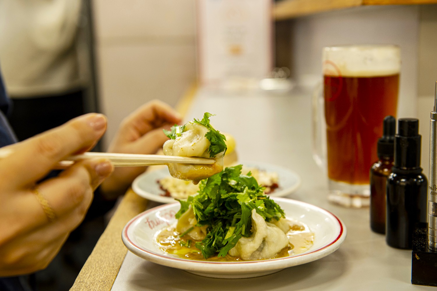 改札内なのに、まるでアジアの夜市のような活気! スタッフがテキパキ立ち働く姿は気持ちいい! 皮や肉のひき方にもこだわり、店の奥で丁寧に手包みされた餃子550円~は、焼きはもちろん、パクチーやシソを使った水餃子もある。包み立てが食べられるという至福をオリジナルのビールや、ジョッキ入りのウーロン茶などで楽しめる。一品料理も充実しているため、あれもこれも食べたくなってしまう。キャッシュレス決済のみ。