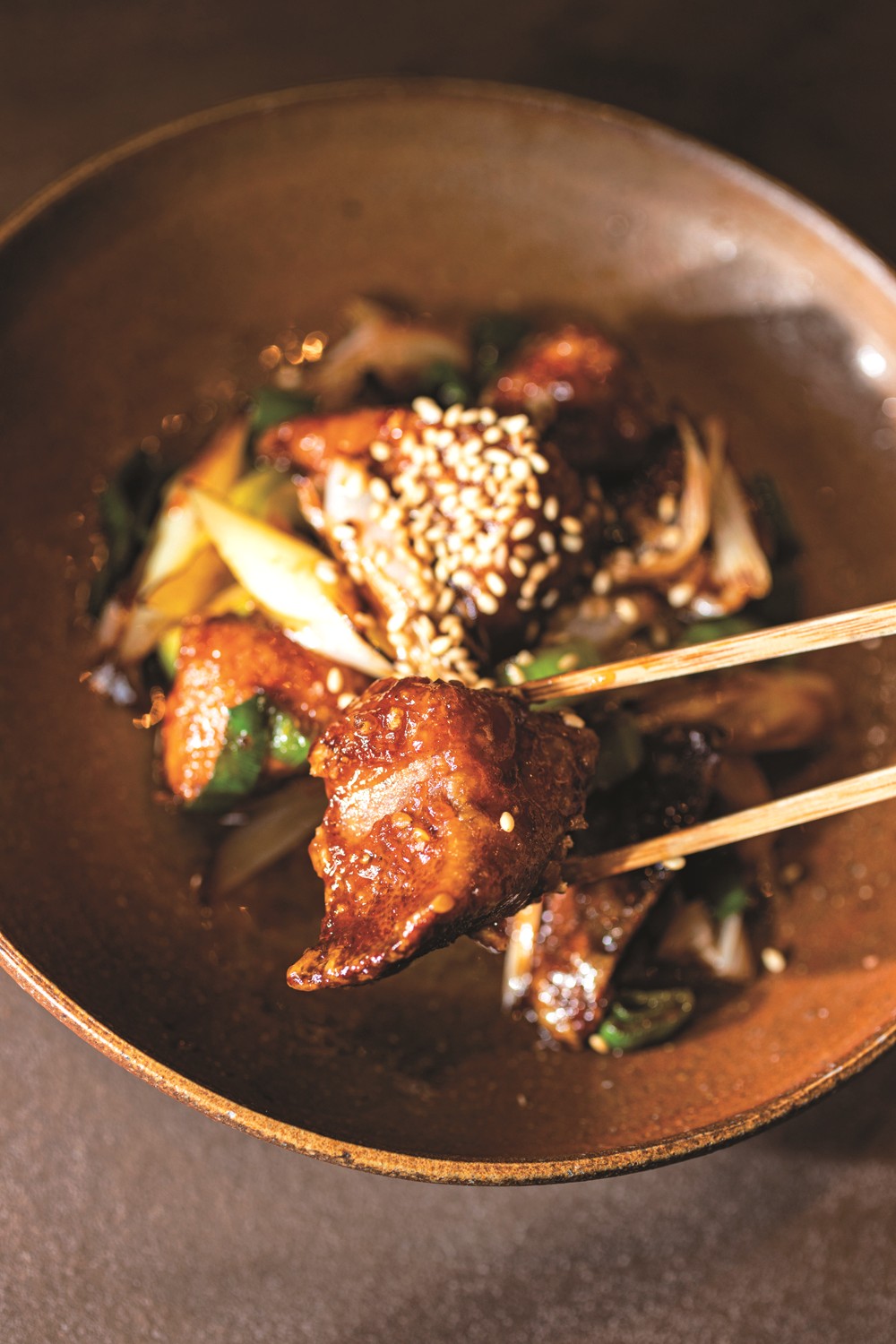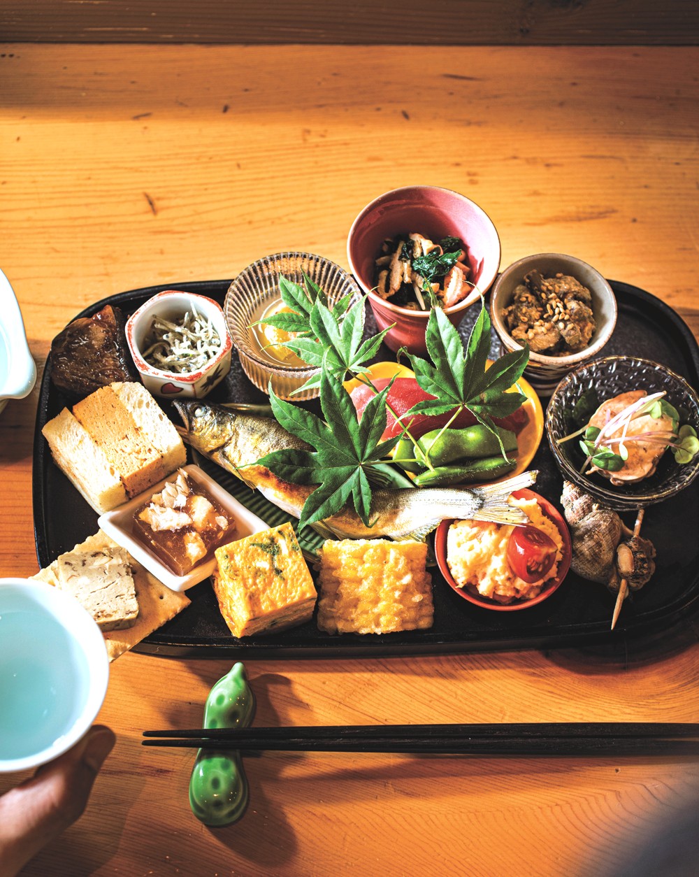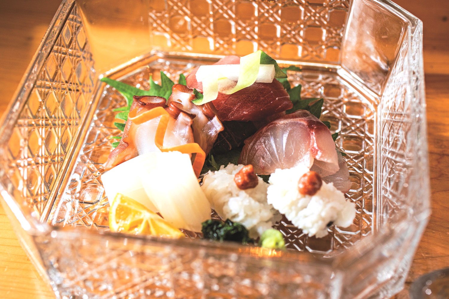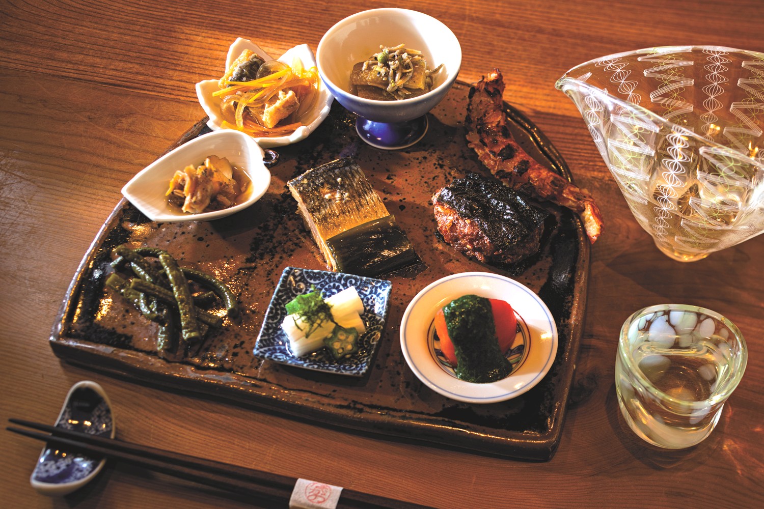 席に着いたなら、何はなくとも前菜8点盛だ。焼きナスとジャコ山椒にエビ味噌漬焼き、桜エビとソバ粉の磯辺揚げ、と手を掛けた料理が飲み欲に火を付ける。これで2合はいけそうである。続くお造りにものけぞる。イサキ焼霜の脂乗りのよさに舌鼓を打ち、イシダイってこんなにおいしい魚だったのかと膝を叩(たた)く。
