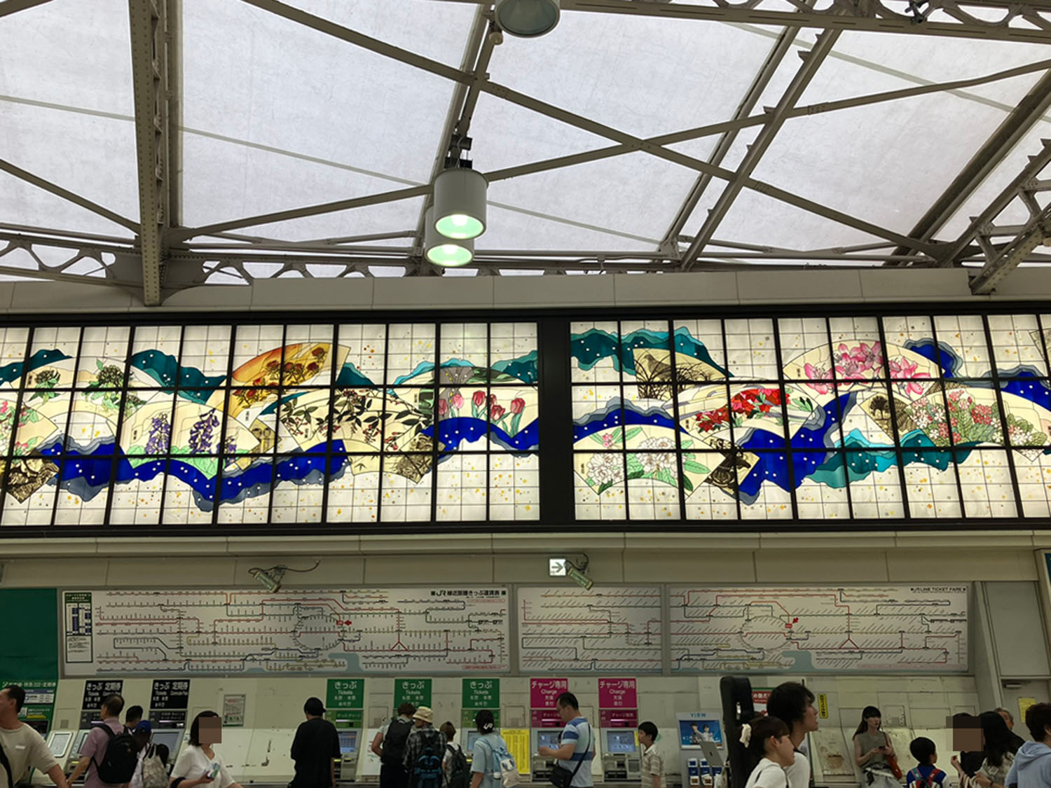 自動券売機上部にある平山郁夫原画のステンドグラス「ふる里・日本の華」など、