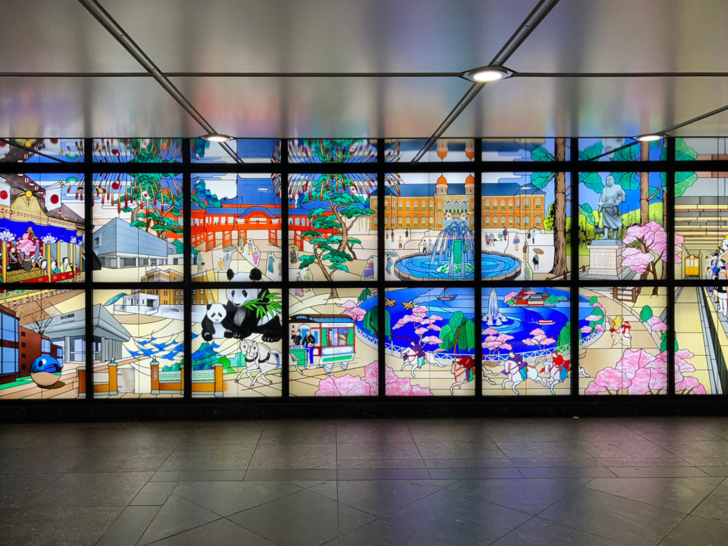 開業当初の回転改札の複製/ステンドグラス「上野今昔物語」(宮田亮平)【地下鉄銀座線上野駅】