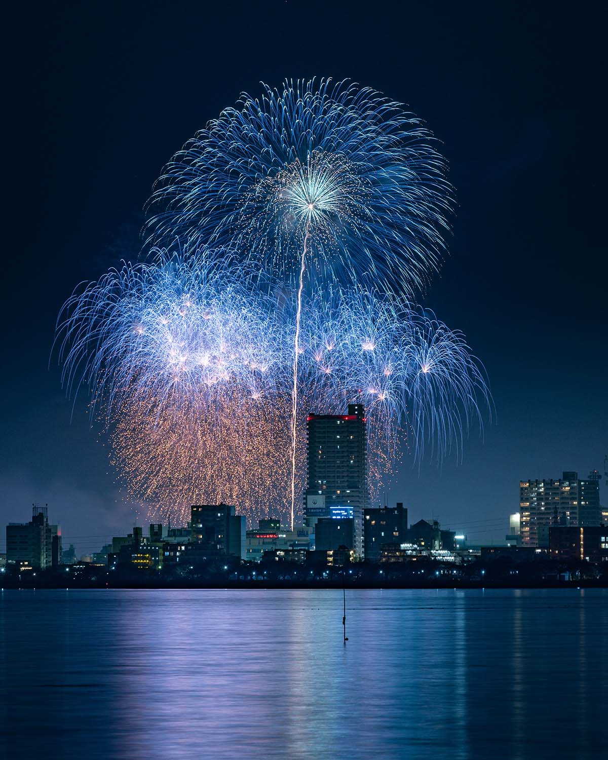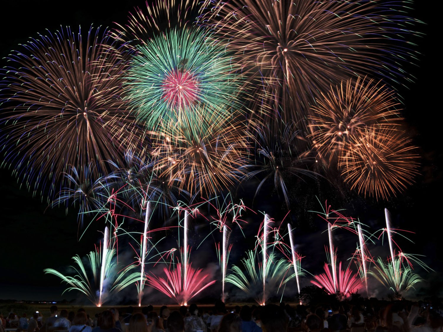 全国から約60の花火業者が集まり、「スターマイン」「創造花火」「10号玉」の3部門で匠の技を競い合う。腕自慢の花火業者がしのぎを削り、自慢の作品を引っ提げて打ち上げる花火は見応えたっぷり。競技の合間には市や企業による余興花火も打ち上げられ、幅500mにおよぶワイドスターマイン「土浦花火づくし」が人気。巷(ちまた)では日本三大花火大会のひとつに数えられ、歴史・規模・技術と三拍子が揃う。17時30分~20時。