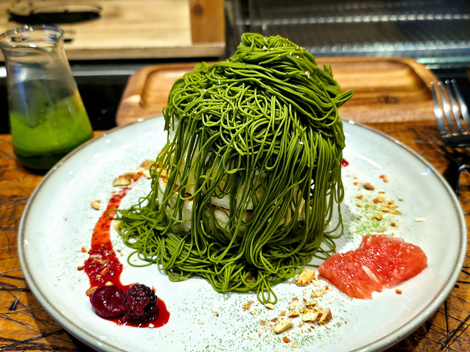 目の前で焼き上げた厚みあるパンケーキの上に抹茶バターをのせて、その上から和栗抹茶モンブランを絞ります。この和栗抹茶モンブランは追加トッピングですが、絶対に付けてほしい黒猫おすすめトッピングです。