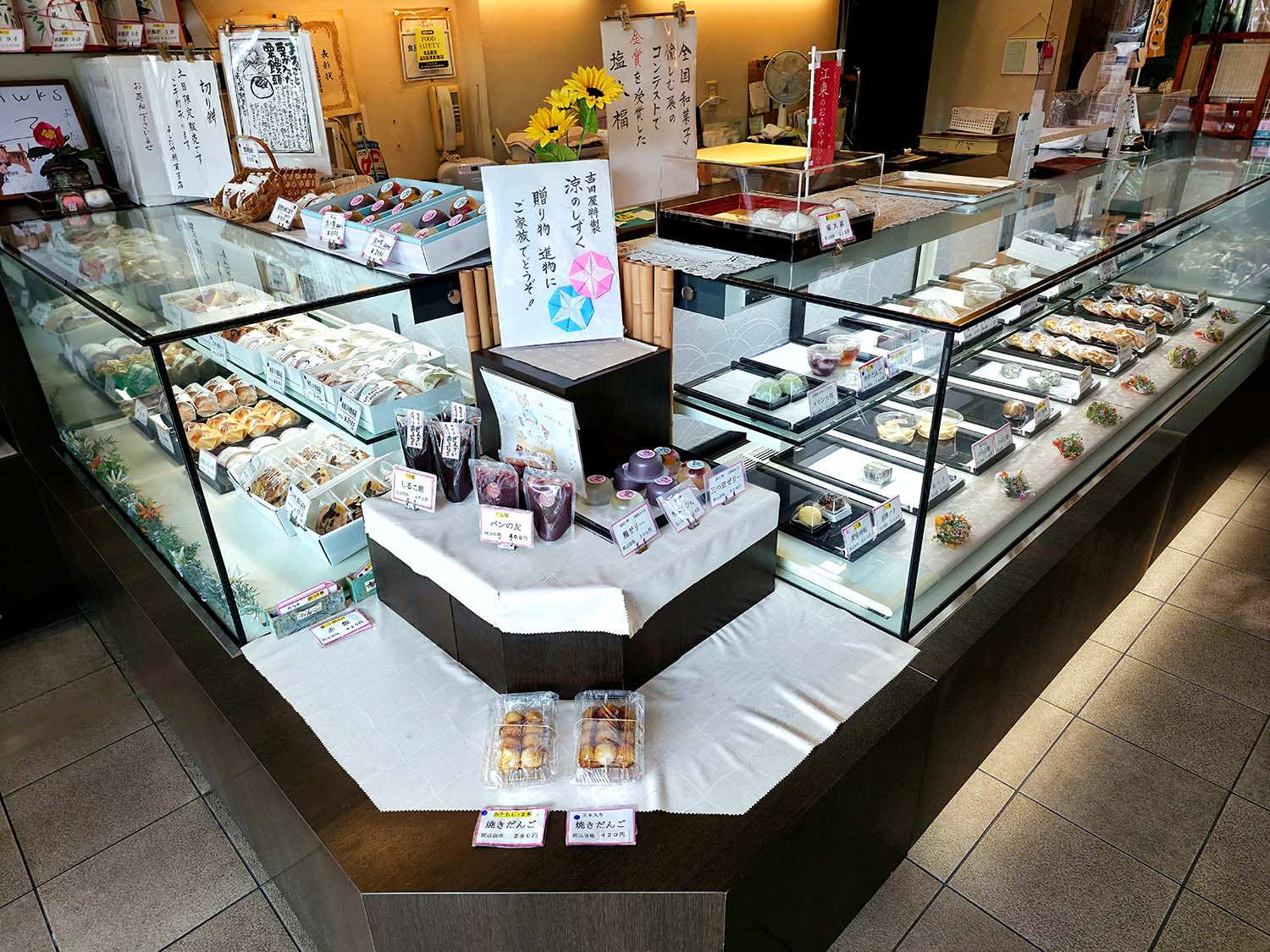 ショーケースに並ぶ和菓子は、定番から季節の和菓子まで豊富なラインアップ。