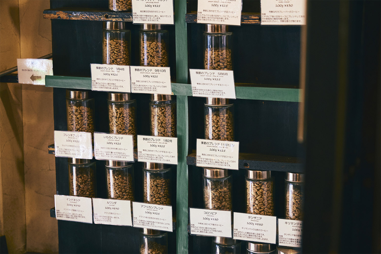 2004年の創業にもかかわらず、その倍以上続く老舗のような雰囲気。「調べるのが好き」だという店主の田中誠一さんはインテリアの細部にまでこだわり、「昭和初期の喫茶店を調べて、それをイメージして店作りをしました」。自家焙煎のコーヒー豆は、少量ずつ作業できる小型の焙煎機を用いることで常時約20種類を用意。店内ではノリタケ社のポットで出してくれ、カップ一杯半ぐらい入っているので安心してゆっくりできるのがうれしい。お菓子も手作りで、たいやきのあんこも自家製。小豆らしさを生かしたつぶあんをココアを混ぜた生地で挟む。