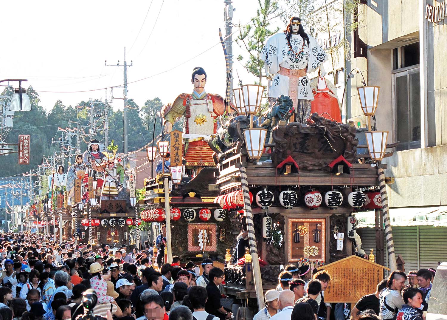 義父 しかし八代将軍徳川吉宗が祭りを制限するようになると、弾圧から逃れるために踊りと囃子が一緒だった大型の屋台を踊り屋台と底抜け(囃子)屋台に分けたりしている。幕末には、江戸城の門を潜れるように人形を二層目に格納できるせり出し付きの三層構造が主流に。川越の山車は天下祭の影響を受けていて江戸型に近い。ちょっと変わったところでは、見事な彫刻で彩られた栃木県鹿沼の彫刻屋台も有名。明治時代になって街に電線がひかれ、東京では神輿が中心になっていったんだ。