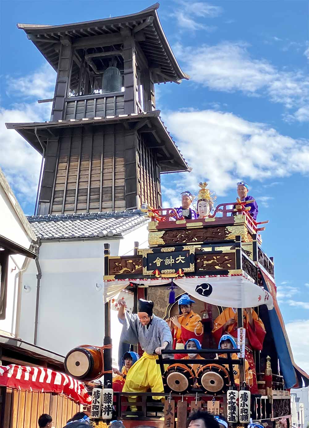江戸の流れを汲(く)む川越の山車は多くの囃子台が回転式で、曳っかわせの際はくるっと向かい合わせに。人形を載せた大きな山車が蔵造りの町並みを通る様子は迫力たっぷり!