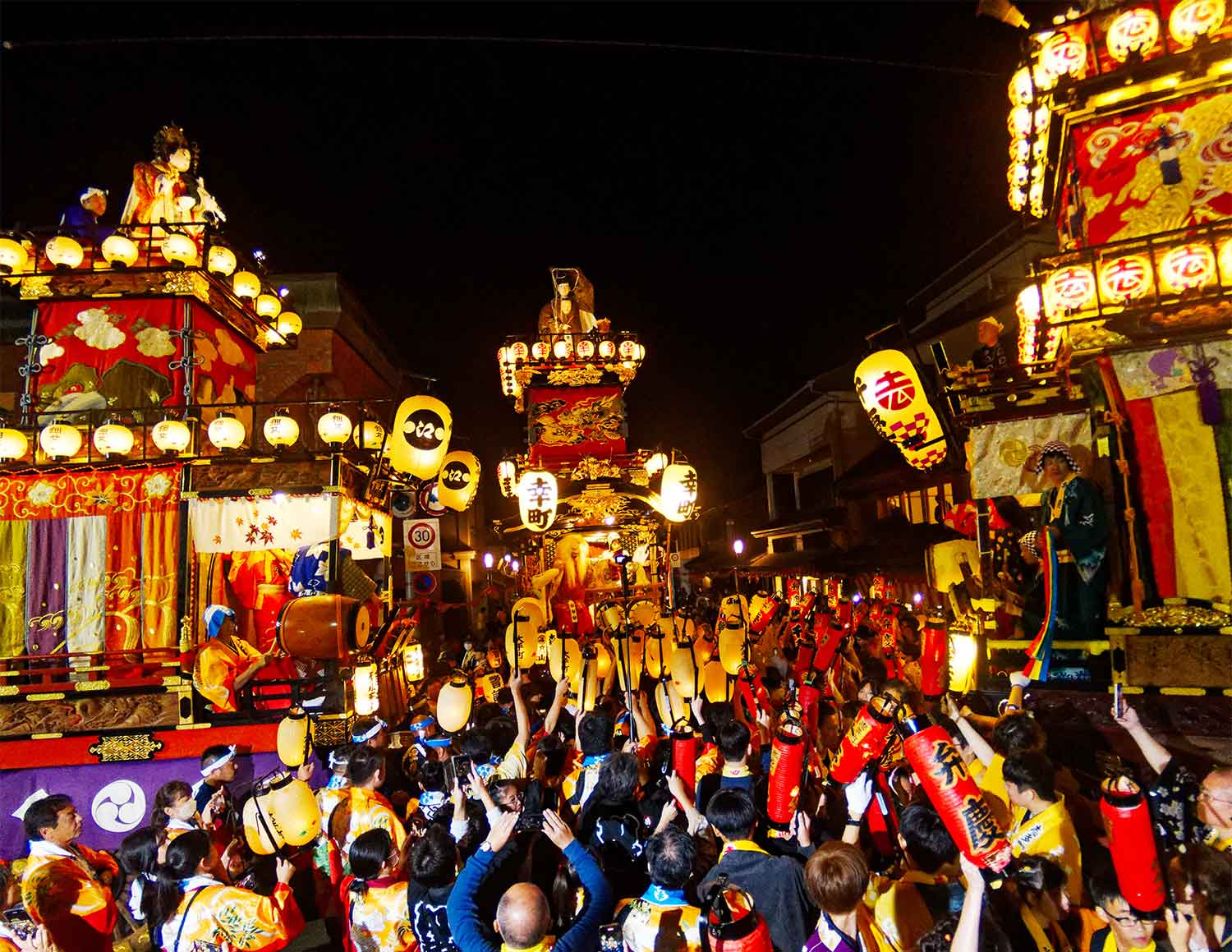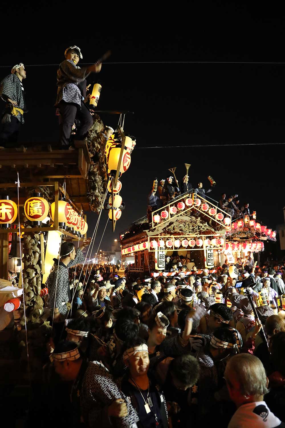 電柱がやたら高かったり、信号が縦型だったりと山車が運行できるよう街がお祭り仕様に。のの字廻しやそろばん曳き、小判廻しと呼ばれる曲曳きには商都の名残が感じられる。