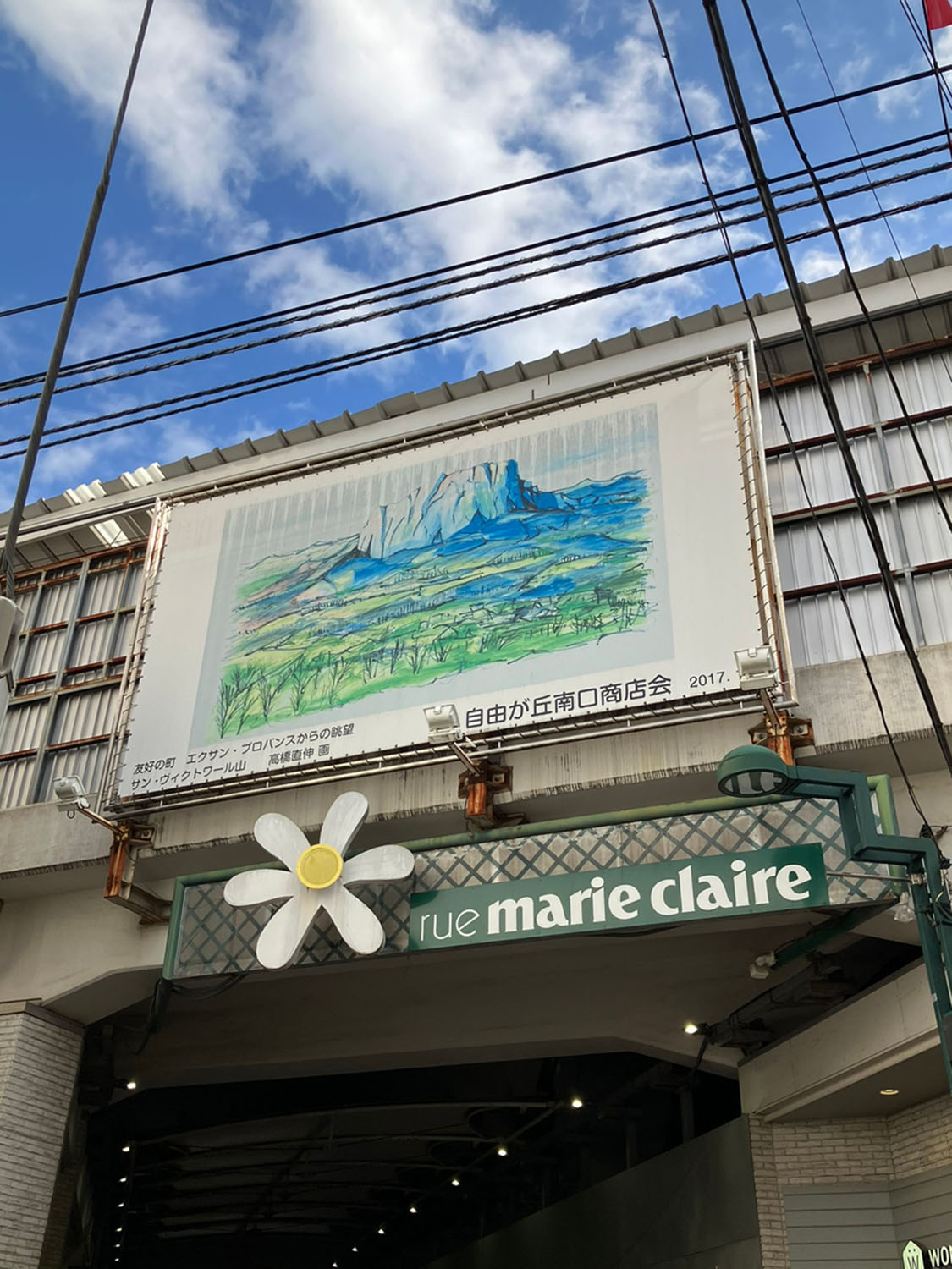 南口近くの壁画と、マリ・クレール通りの表記。自由が丘の住民に聞くと「マリ・クレールのお店はなくなったのに、通りの名前に残っているのよね」とのことで、通りの名前の由来とは異なる説が浸透しているようだ。