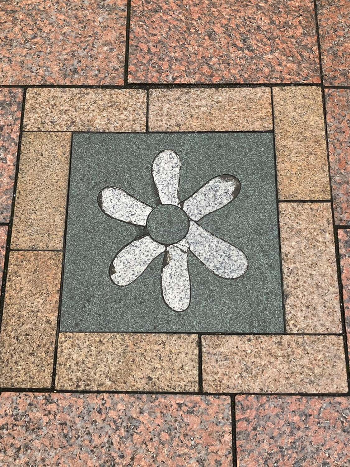 マリ・クレール通りの地面には、よく知られた花の模様があしらわれている。