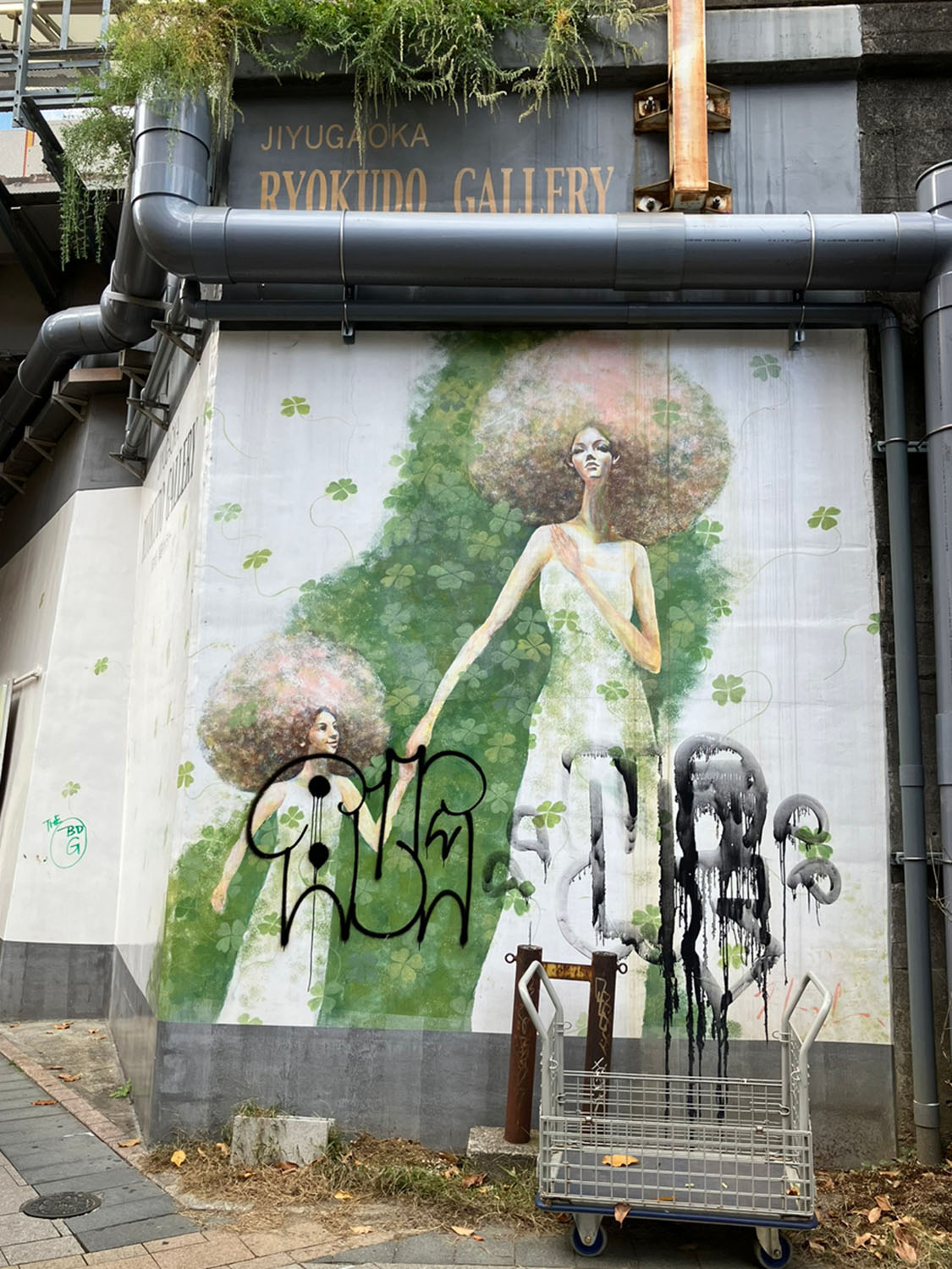 緑道ギャラリーの素敵な壁画。落書きがされているのが残念である。