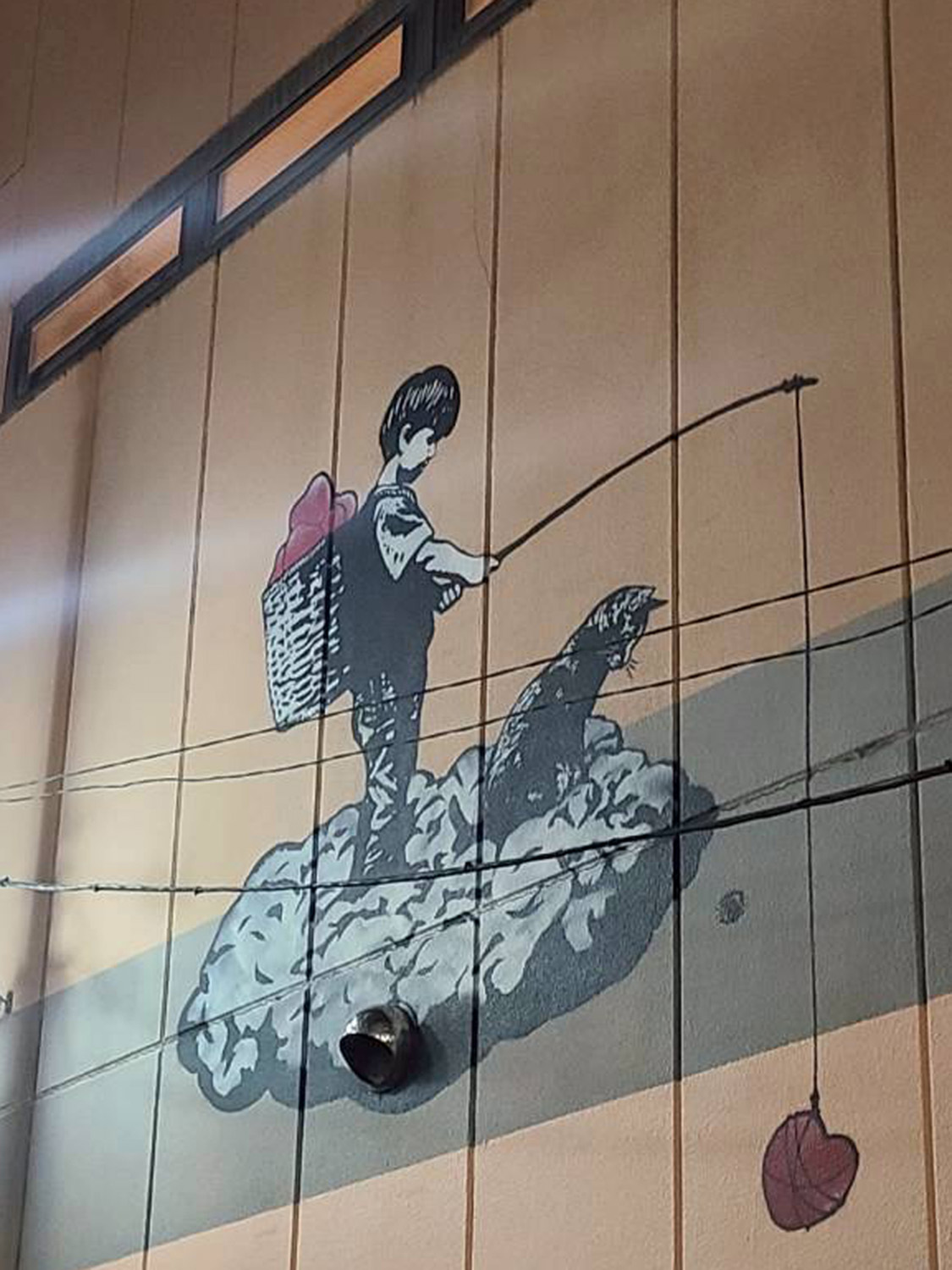 少年と猫がハートを釣り上げている壁画は、「不二屋書店」の頃から変わらずあるもの(友人Mさん撮影)。