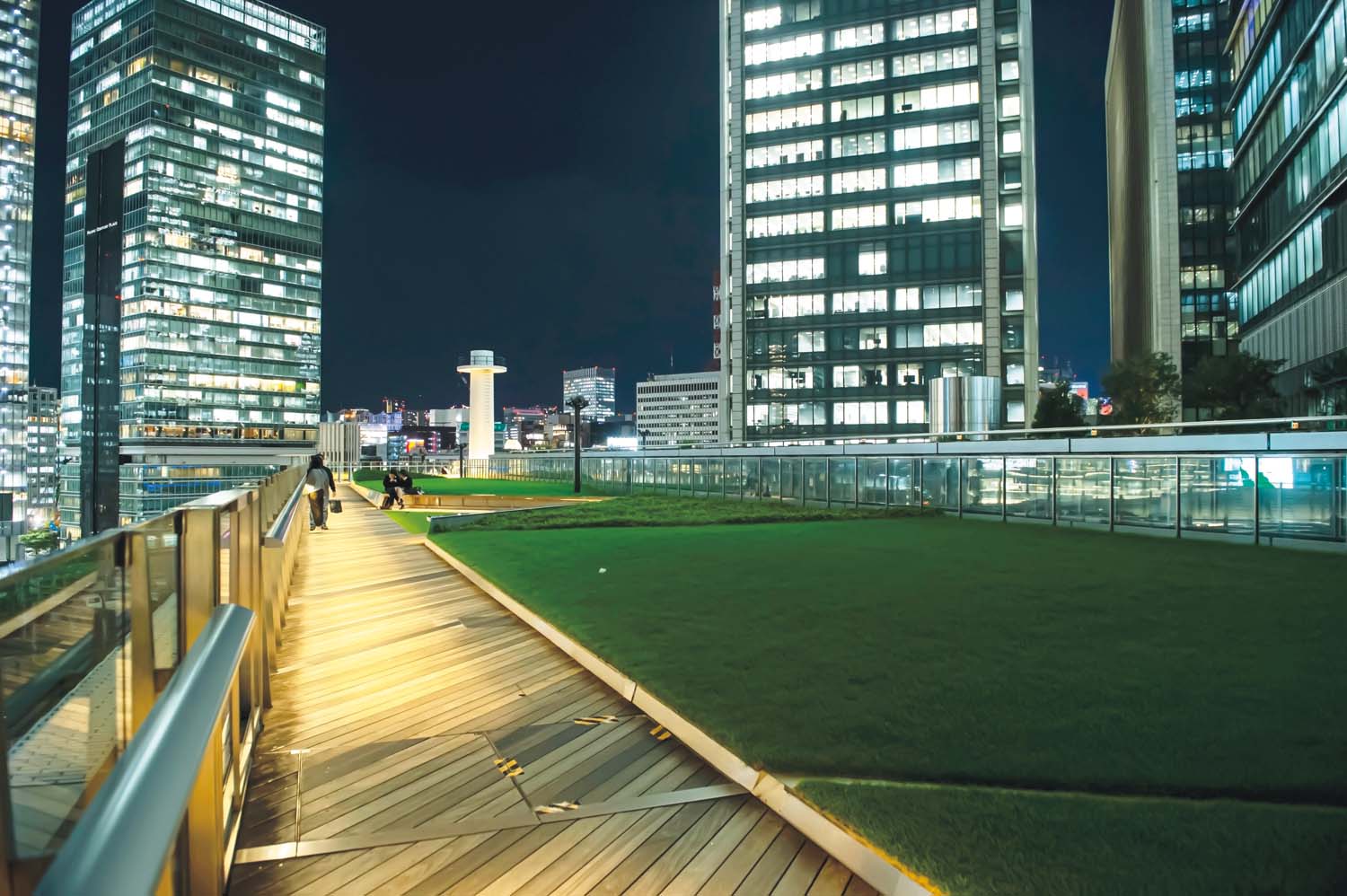 JPタワー・KITTE6階の屋上庭園。無料で開放されており、気持ちのよいウッドデッキを歩きながら眺める東京駅の夜景は格別だ。