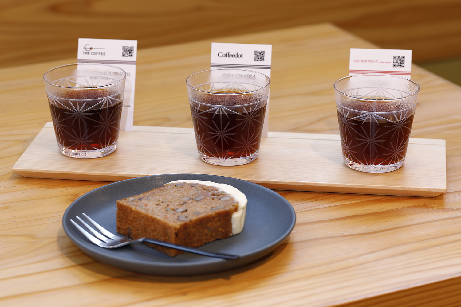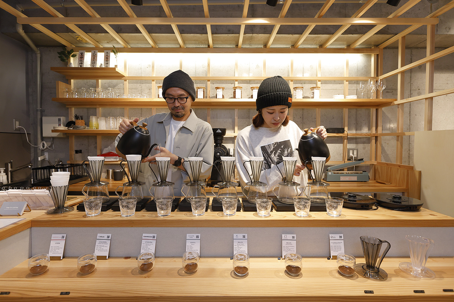 日本各地のこれぞという自家焙煎コーヒー店の豆を取り寄せ紹介する斬新なカフェ。看板メニューは「コーヒーフライト」。2、3、4種のコーヒー豆を選びさまざまな店の味を飲み比べ。カウンターの見本で豆を確かめる趣向も乙。最新式ドリッパーを使用して丁寧に味を引き出し、切り子グラスで提供するコーヒーは見た目も美しく、ワインのような繊細な味わい。コーヒー好きには至福のひと時だ。