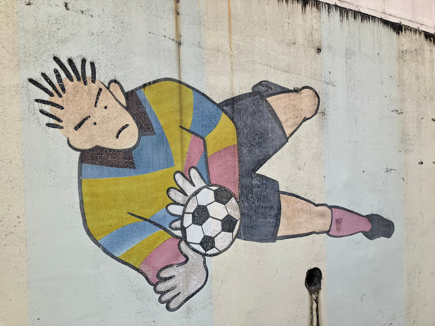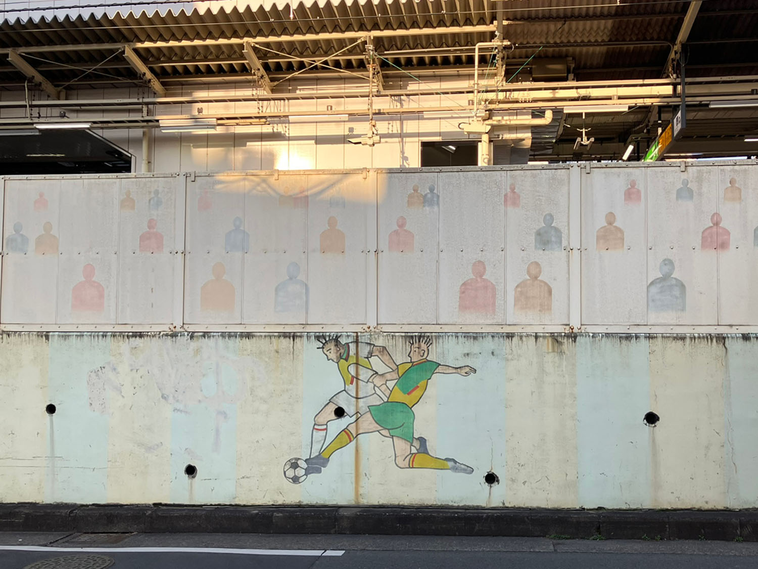 実は成瀬方面に向かう線路沿いには、巨大なサッカーの壁画がある。歩道も狭いため待ち合わせには不向きなのだが、待ち合わせ相手がなかなか現れない時など、散歩がてら眺めてみるのもいいだろう。