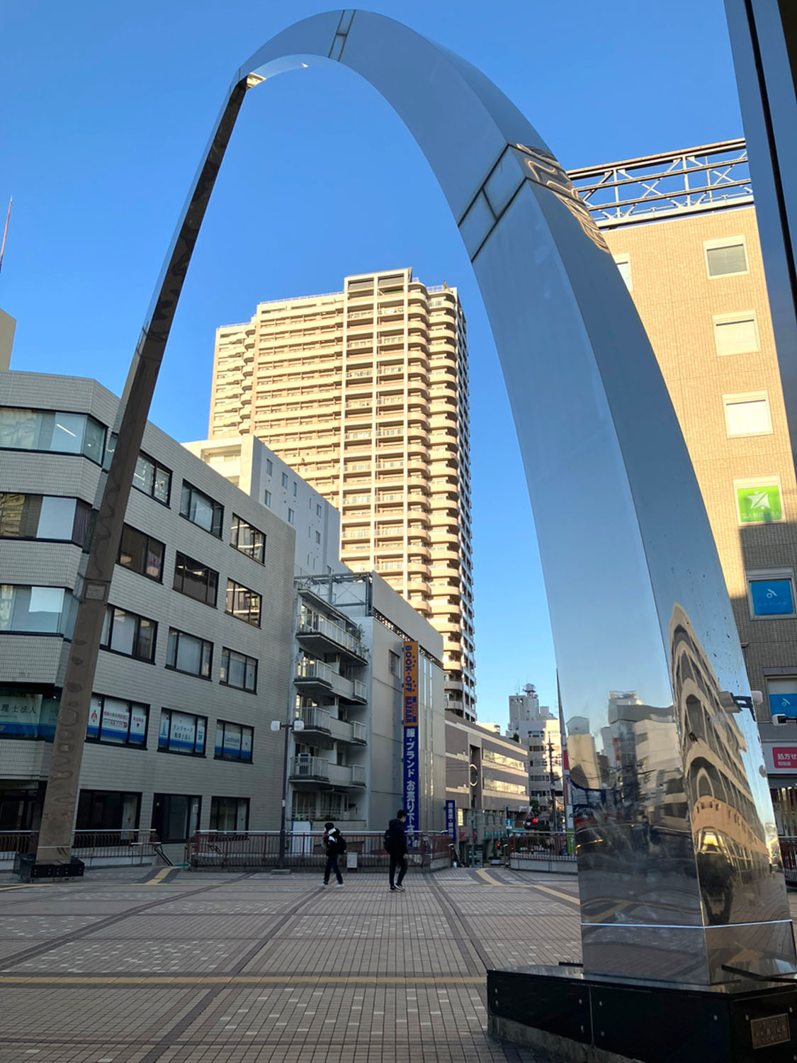 巨大な金属製のアーチ根元には方角が書かれており、「シティゲート北側の根元で待ち合わせね」といった利用もできそうだ。なおこちらも鏡面仕上げのため、夜には反射で光る。