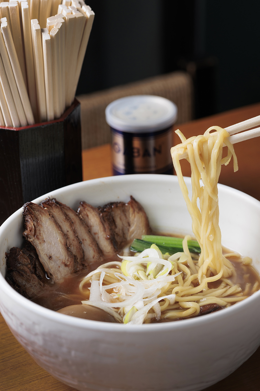 煮干しや鰹など数種類の出汁をベースに、豚ガラ、鶏ガラ、野菜などを6時間煮込んだスープ、3種類の醤油をプラス。濃いめの魚介系醤油ラーメンだが、どことなく懐かしい優しい味だ。「まろやかさを加えるために、赤ワインを少し入れています」と店主の増岡栄治さん。麺は市川の早川製麺に、オリジナルレシピで注文。小麦の種類から練り具合まで試行錯誤を繰り返し完成したという。奥さまの接客も温かく、また帰ってきたくなる場所。
