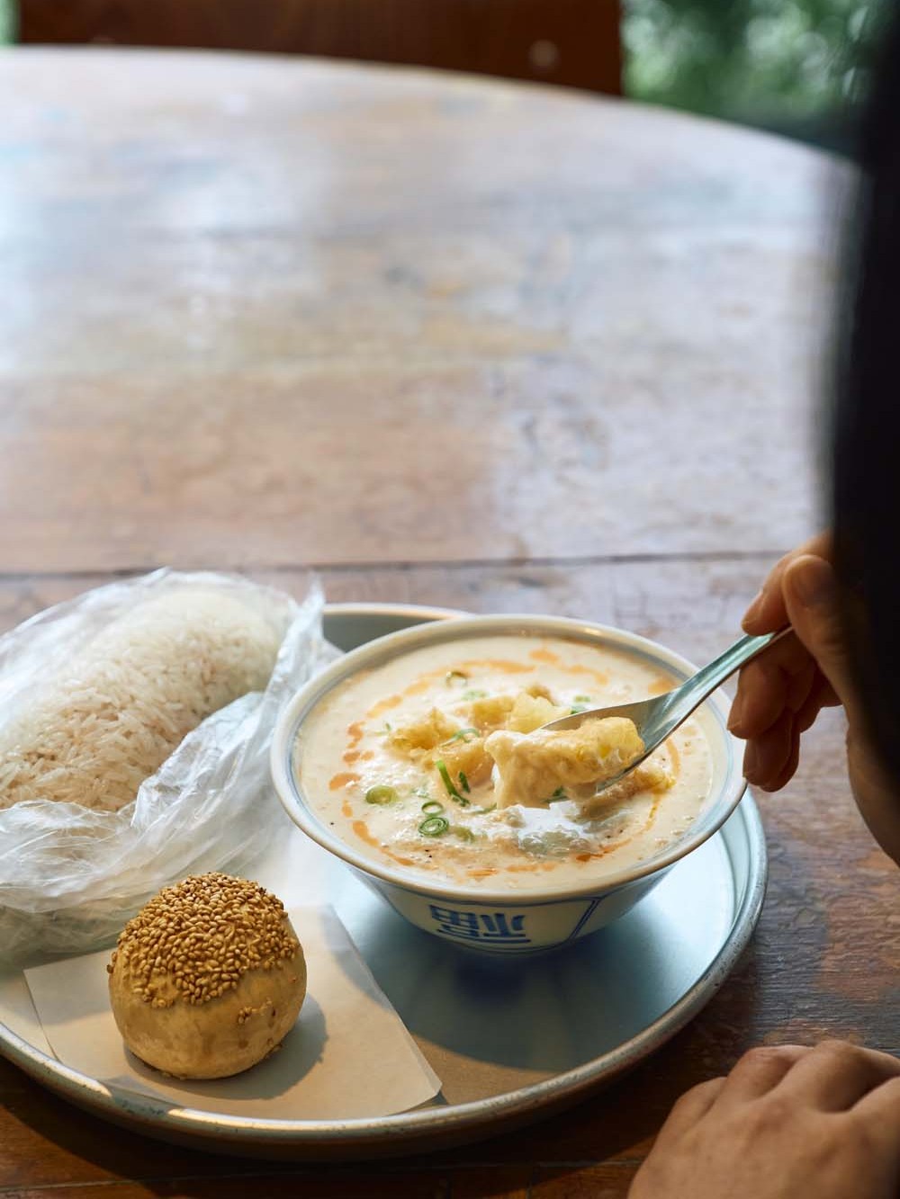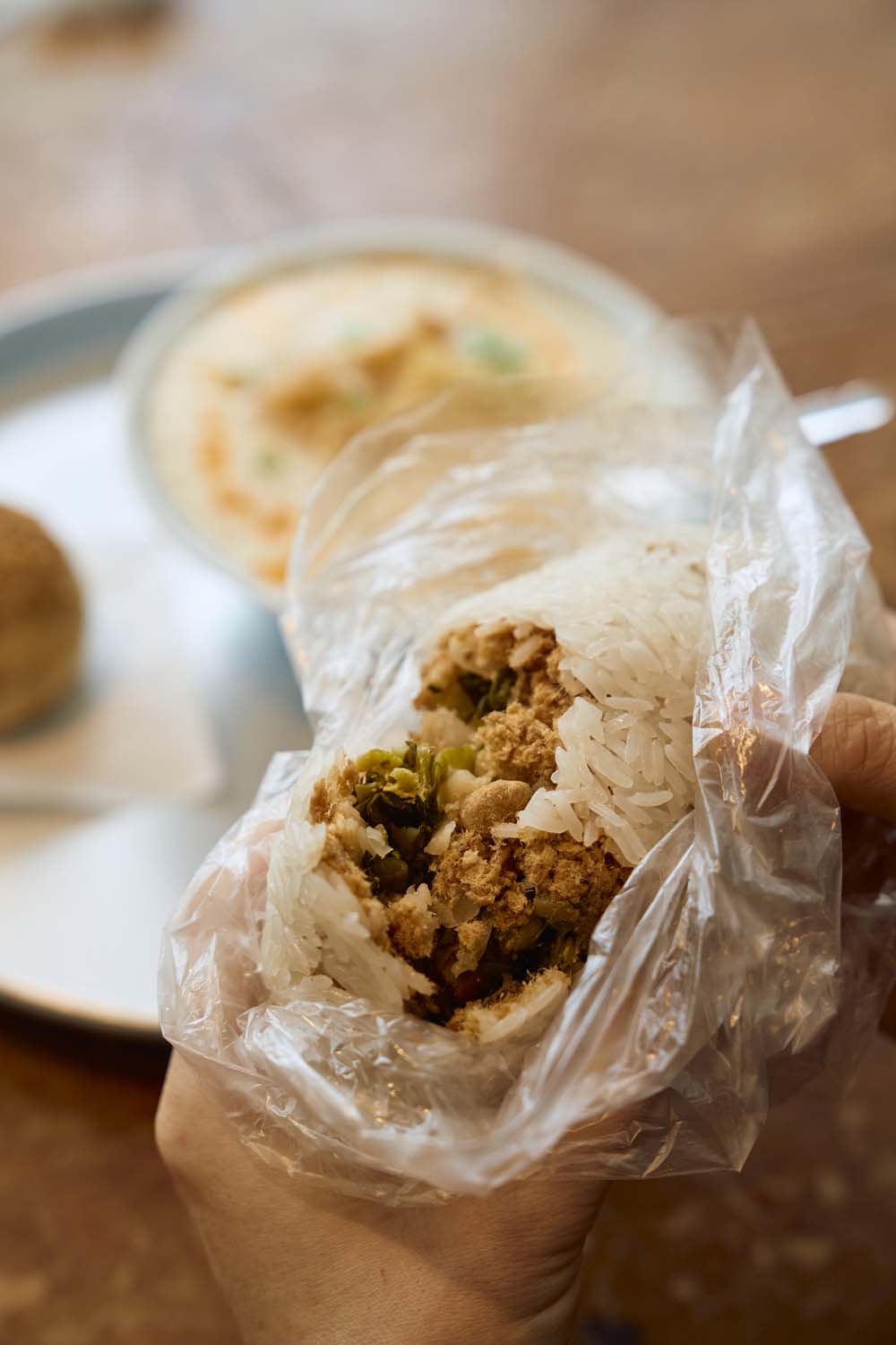 すうっと鹹豆漿(シェントウジャン)(豆乳スープ)を啜(すす)れば滋味が広がり、体がじんわりほぐれる。豆乳は風味の強いミヤギシロメを使い、店内で製造。できたてゆえに後味は軽く、ほのかに甘みが残る。酢と醤油の味付けもしっかり効いて、眠っていた食欲が覚醒し、おかげでもち米を握った糰飯(ファントァン)(台湾式おにぎり)にも自然と手が伸びる。こちらはかぶり付いてびっくりの具だくさんで、なかでも自家製だれで煮込んだ、五香粉が香る煮卵や、二度揚げしたカリカリの油條(ヨウティヤオ)(揚げパン)がインパクト大。食べ進めるごとにそれらの個性が口の中で調和し、クセになる味わい。