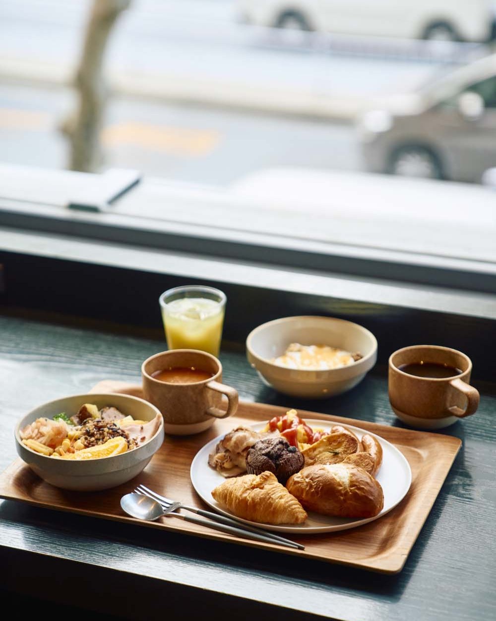 コンセプチュアルで洗練されたデザインの『DDD HOTEL』に入っているカフェ。朝食ビュッフェは宿泊していなくても利用でき、インバウンド客に混ざって旅の途中にいるような非日常を味わえる。センターテーブルには手の込んだ料理が並び、あれこれ目移りしているうち、気づけば皿は山盛り。リンゴチップでスモークした自家製ベーコンをかじると、脂の甘みが舞う。サラダバーの葉物野菜は埼玉の須永農園が厳選したその時期のおすすめらしく、色がくっきりして見るからに鮮度がいい。味が濃く、シャキッとした歯応えに心が踊る。