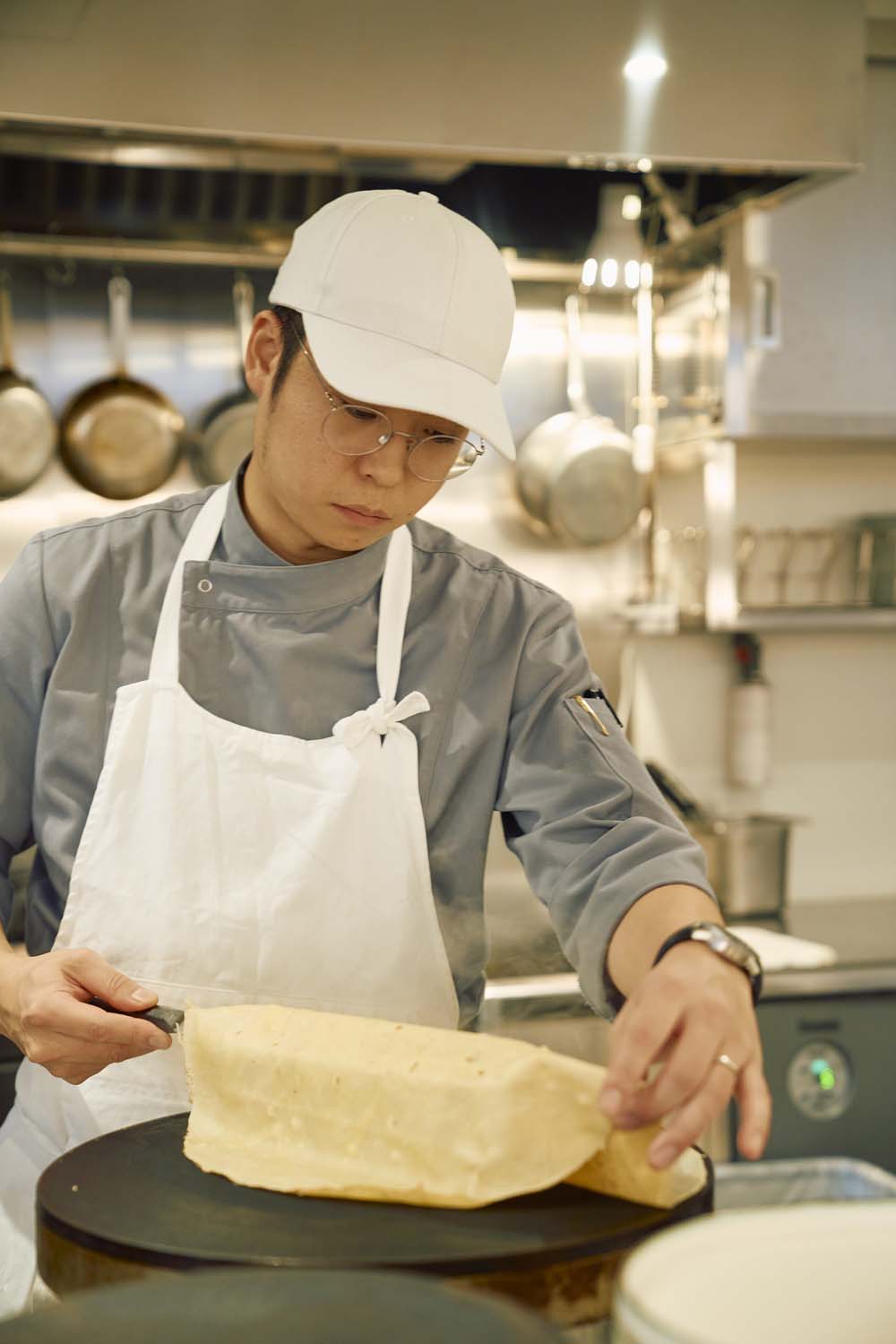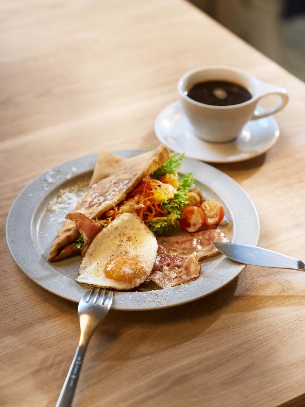 店は買い物客でにぎわう商店街の中にあり、「平日の朝は、子供を幼稚園に送り届けたママさんたちが息抜きをしに来てくれます」。日常をほんの少し特別に彩ってくれるのは、フランス菓子の名店で腕を磨いた友納滉一さんがその技法に基づき、独自にこだわり抜いたクレープだ。モーニングプレートは、お菓子用にパリッと薄く焼いた生地とはテクスチャーを変え、厚みを出し、もっちりした食感に。サラダやベーコン、目玉焼きと一緒に食べる甘じょっぱいクレープサレで、噛(か)み締めるとフランス産と国産をブレンドした小麦の旨味がじわり。