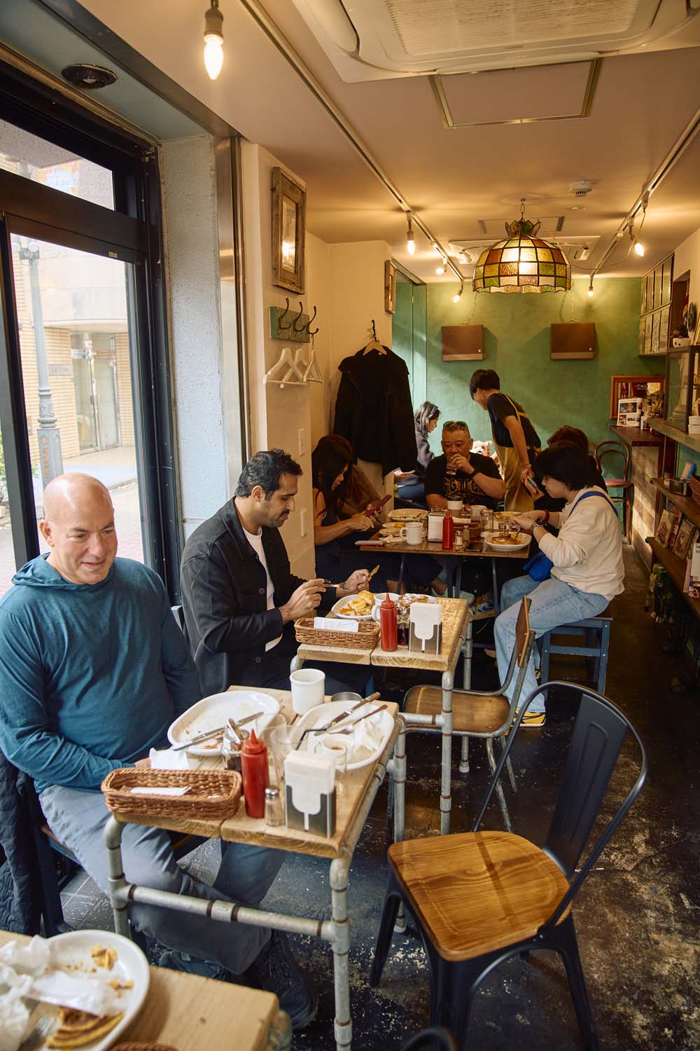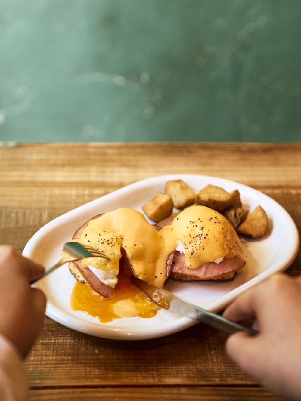 外はサクッ、中はしっとりの自家製ビスケットにハム、ポーチドエッグを乗せ、オランデーズソースをかけたエッグベネディクト。本場のアメリカに比べると味は濃くないが、甘みと塩味が絶妙に合わさり、後を引く。日本ではめずらしい「オールデイ・ブレックファースト」の店で、和気あいあいとした空気でいっぱい。店主の布施里英さんが言う、「子供の頃に親戚のいるアメリカに遊びに行くたび、みんなで朝食を食べに行ったダイナー」がモチーフになっていて、トラディショナルなアメリカンスタイルの朝食を楽しみたい老若男女が集う。