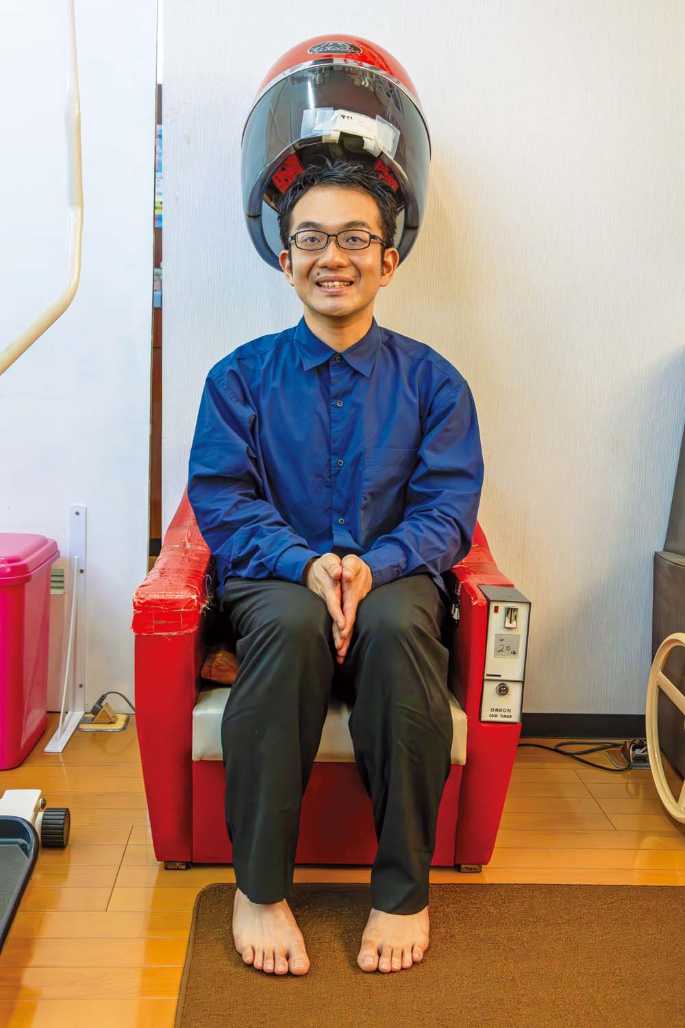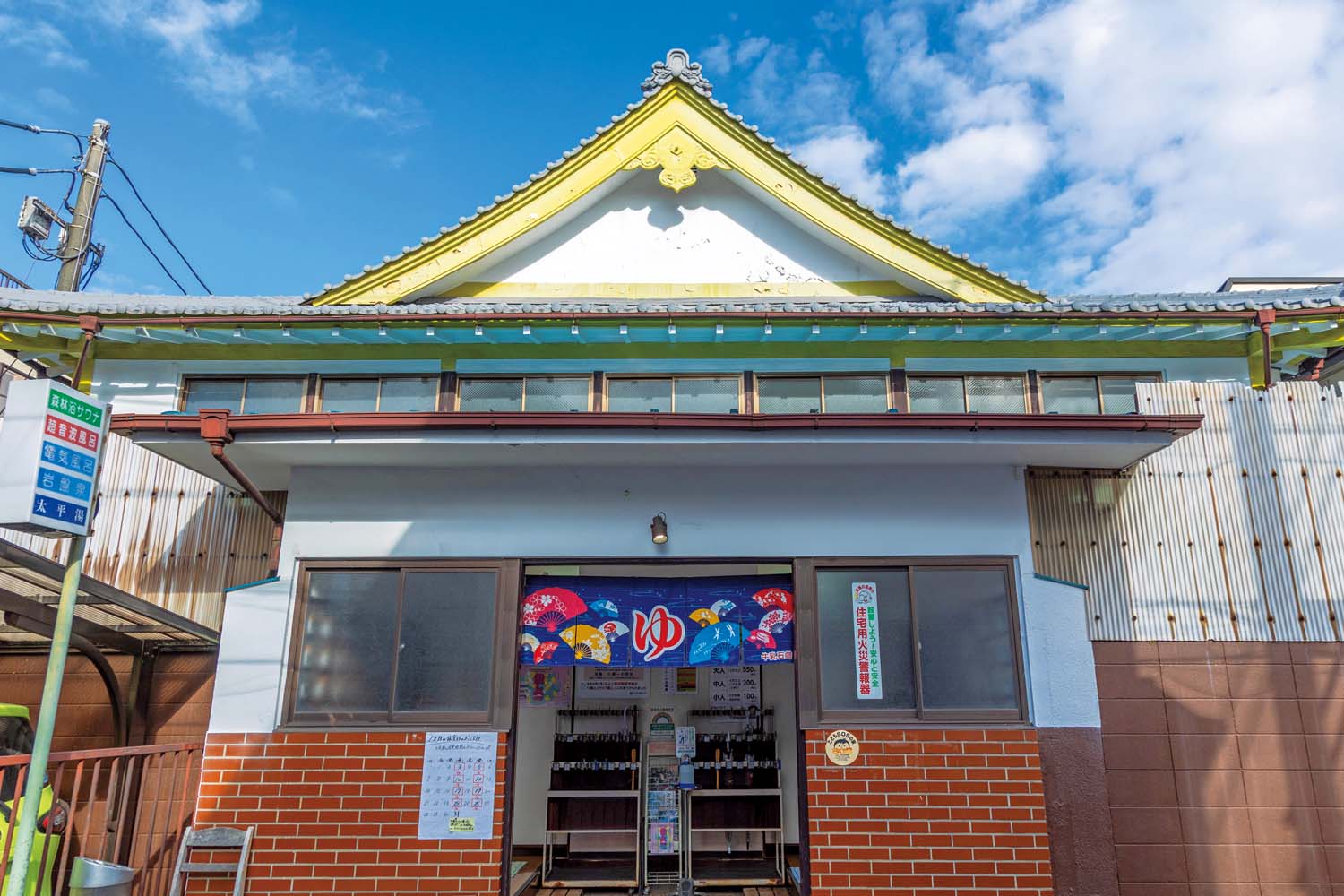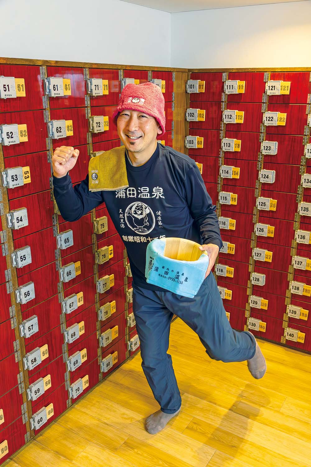 作業療法士だった渡邉大和さんが、1年ほど前に父から継承。「ペンキ絵の壁の裏にある実家で育ったのでここへの愛着が深い。宮造りのこの銭湯をなくしたくなかったんです」。女湯のかぶる形のドライヤー(写真右下)や男湯の体重計など、昭和風情がそこかしこに。脱衣所と風呂の間のガラス窓に四季折々の風景を自身で描いたり、巻くと牛乳瓶型になるタオル瓶牛乳を考案したりと、新たな挑戦も!