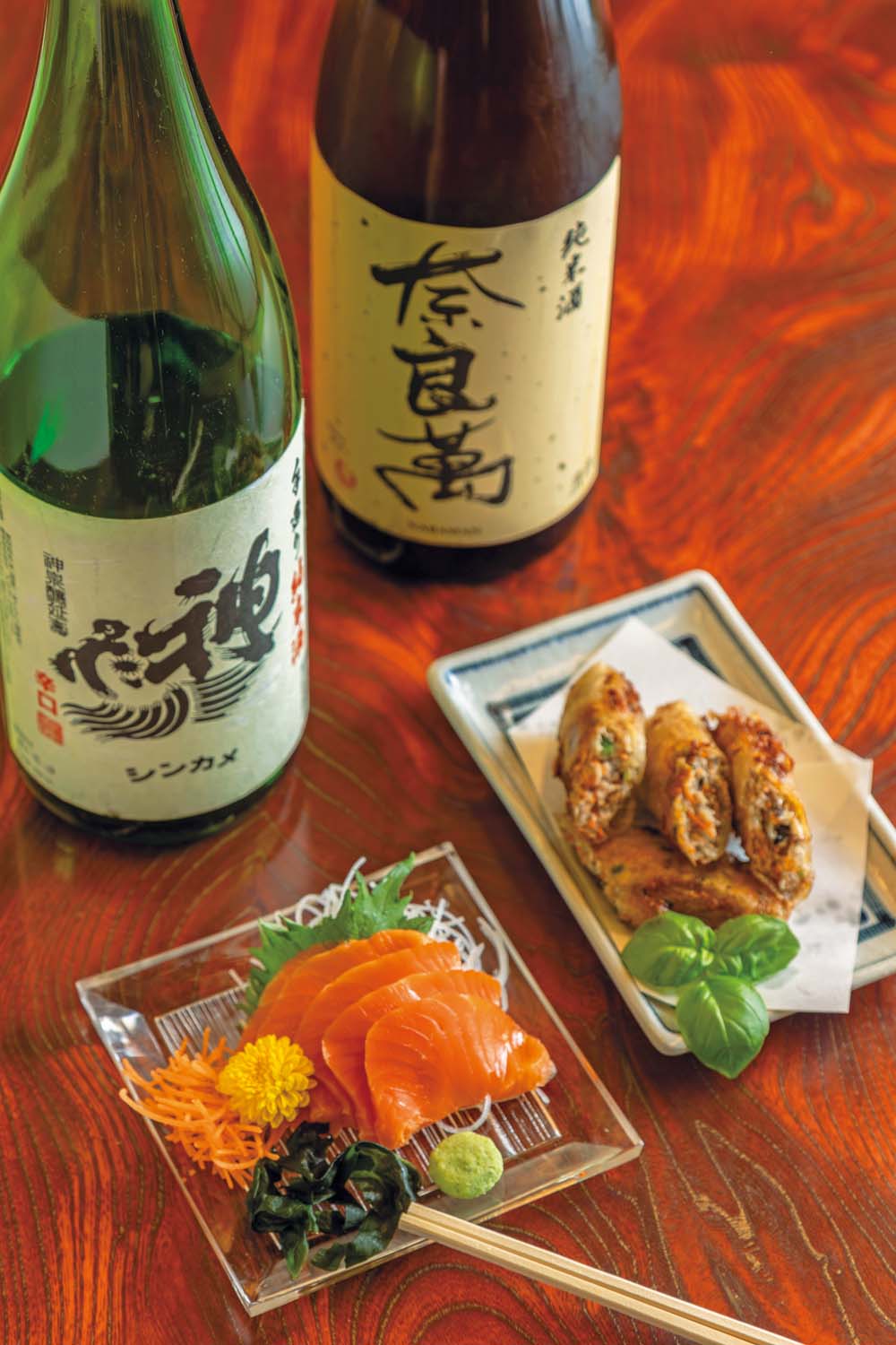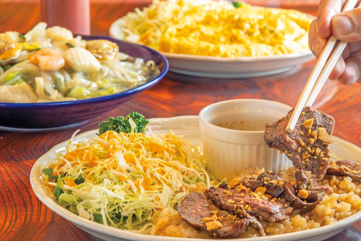 ガーリックライスステーキのせ1000円ほか、街の居酒屋や食堂と遜色ないメニューが、100種近く。日本酒は左党も納得の品揃え。