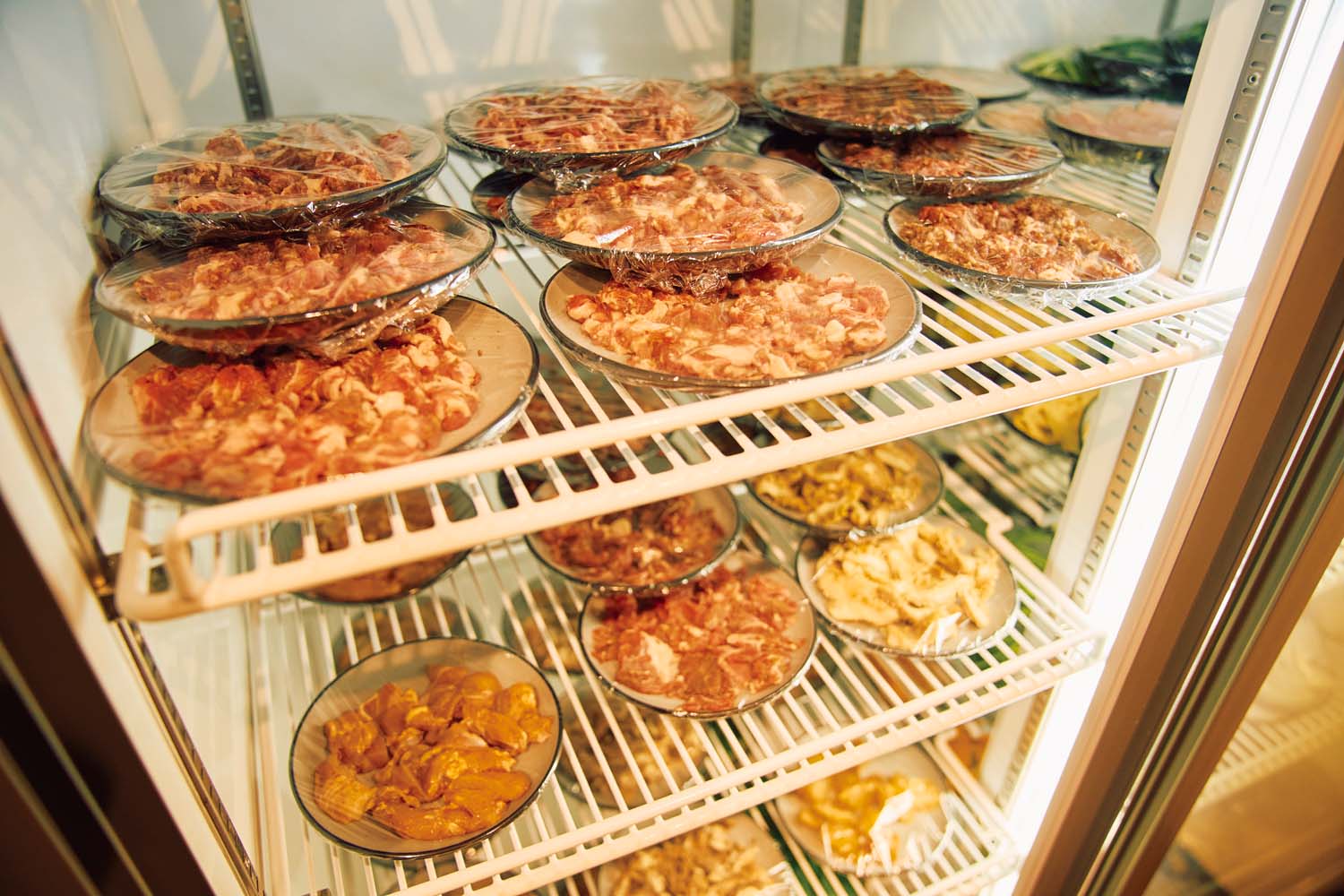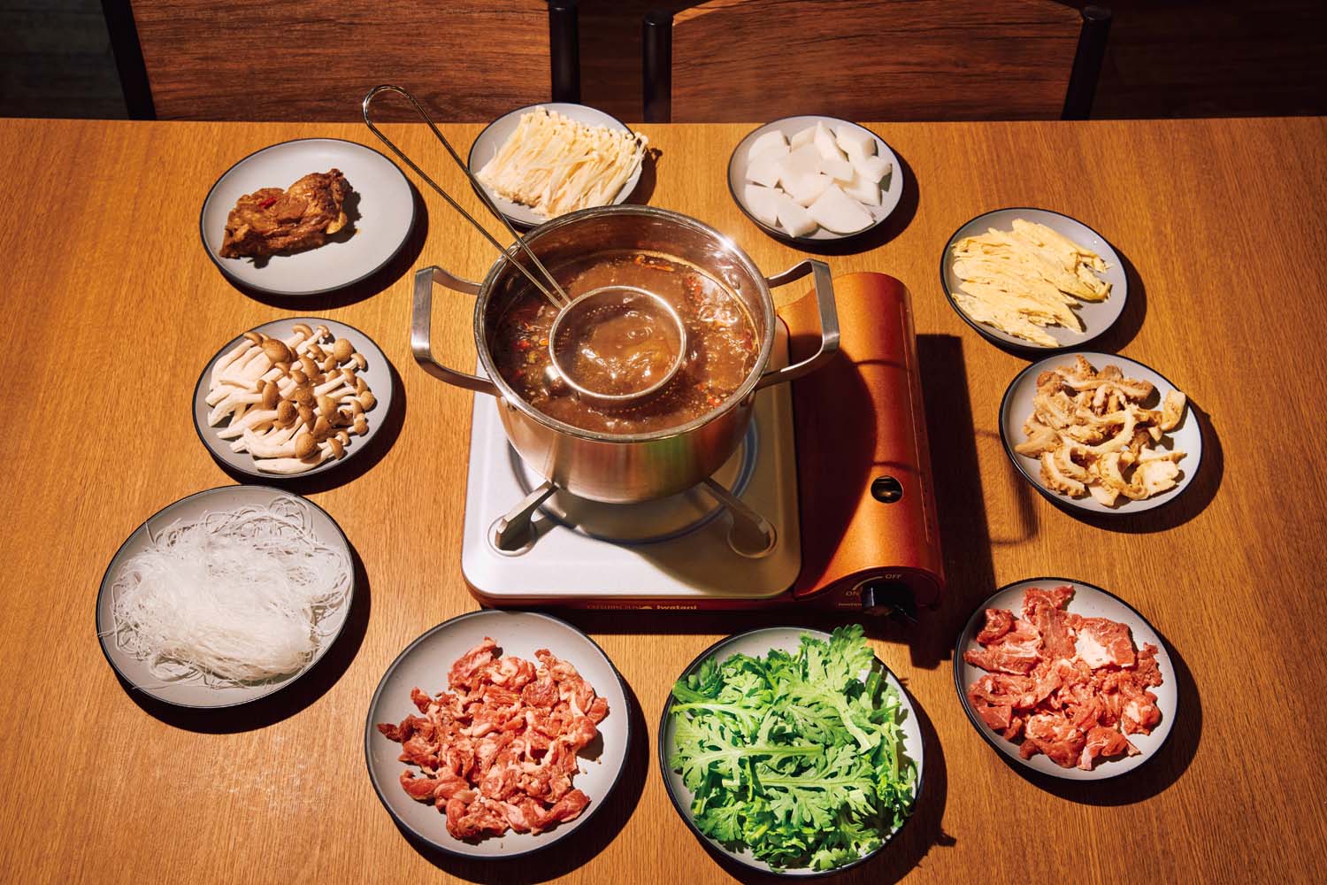 中国でも有数の激辛料理で知られる湖南省で修業した紅(べに)さんがふるまう鍋は、タレを使わずスープと共に味わうスタイル。八角や草果、シナモンなど漢方と、骨付き豚肩肉が溶け合ったスープは濃厚でスパイシー。辛味も細かく調整できる。具材は下味をつけた柔らかい牛ハラミやラム、魚やロブスターの団子、凍(し)み豆腐、締めの春雨まで迷うほど。「このスープには大根がよく合うので外さないで」と紅さん。小皿で提供されるため、ガッツリ系にもヘルシー系にも自分仕様の火鍋をカスタマイズできる。一人でも楽しめる鍋のサイズ感もうれしい。
